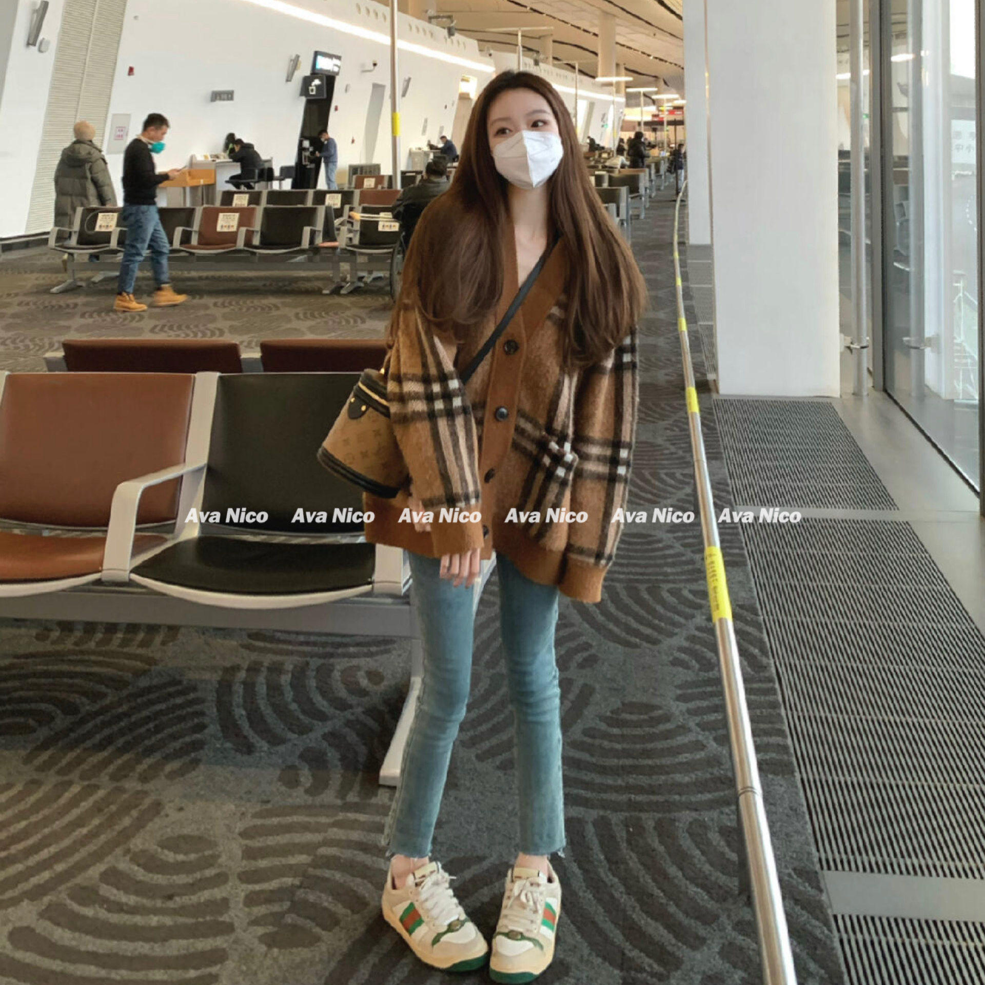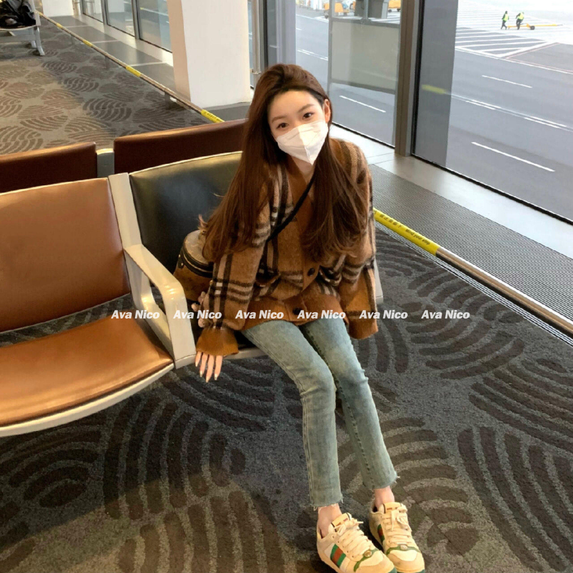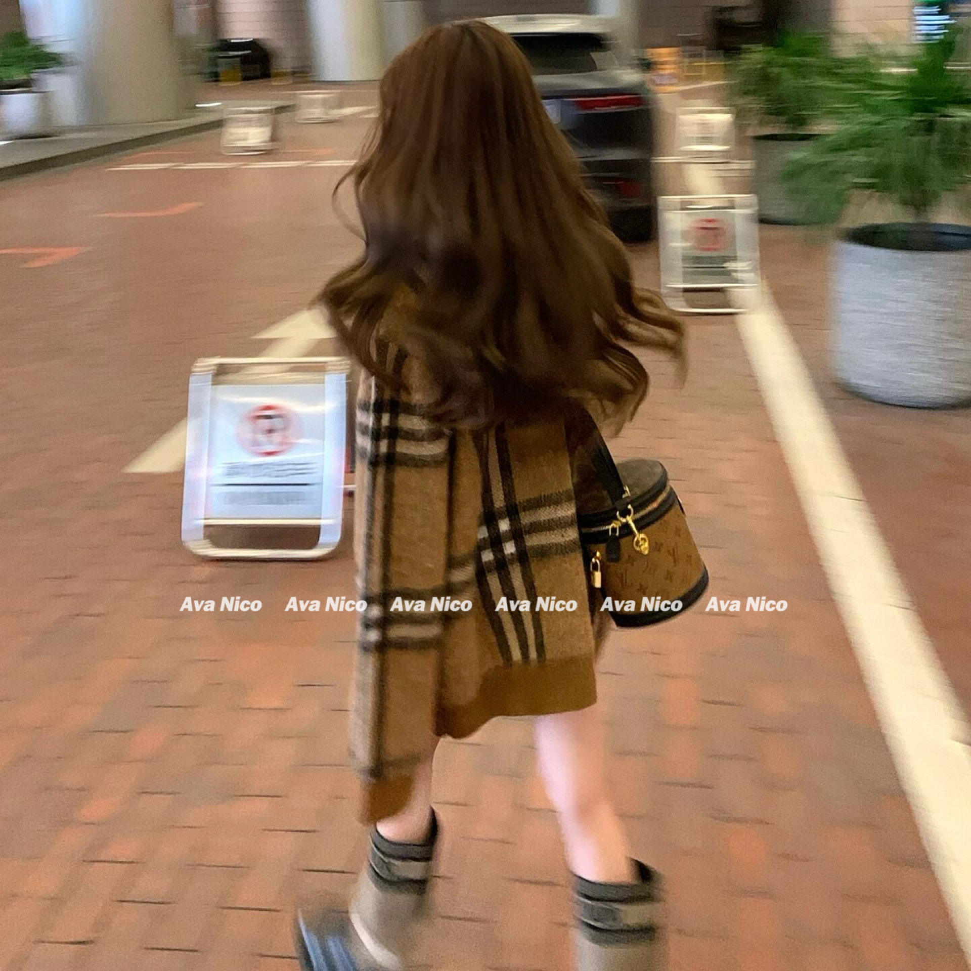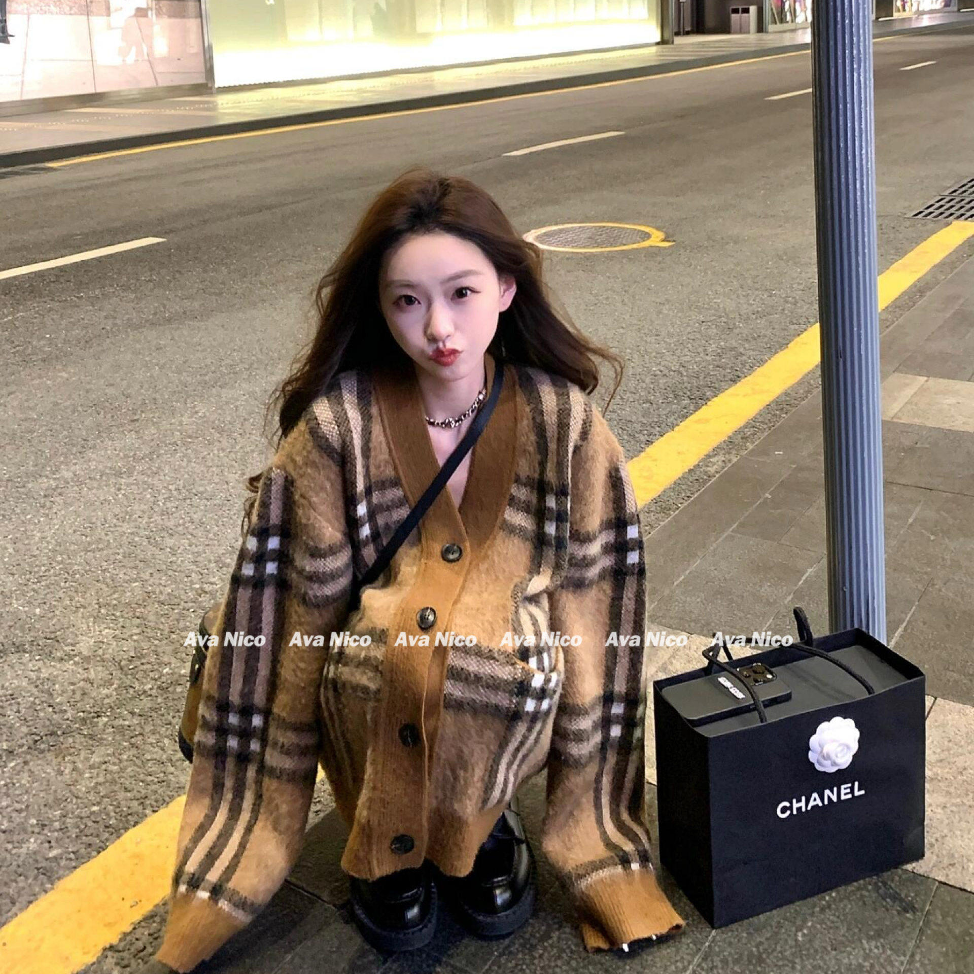 高货开模~老钱风复古V领格子毛衣外套女慵懒风马海毛针织开衫上衣