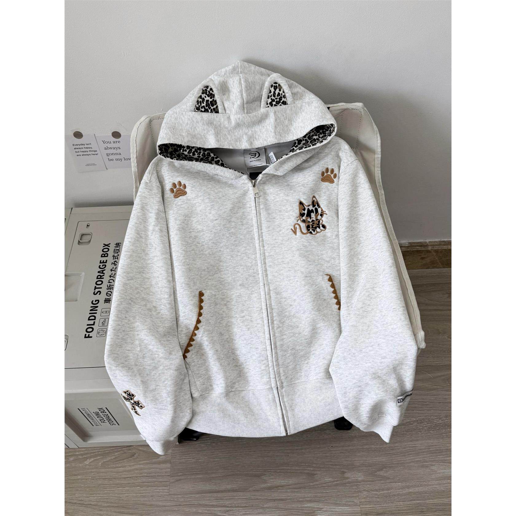 Nuneon美式覆古开衫拉炼外套豹纹恶魔秋冬宽松加绒连帽卫衣女情侣