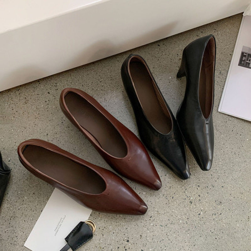 法式小方头单鞋2026新款通勤中跟百搭高跟鞋真皮浅口一脚蹬奶奶鞋