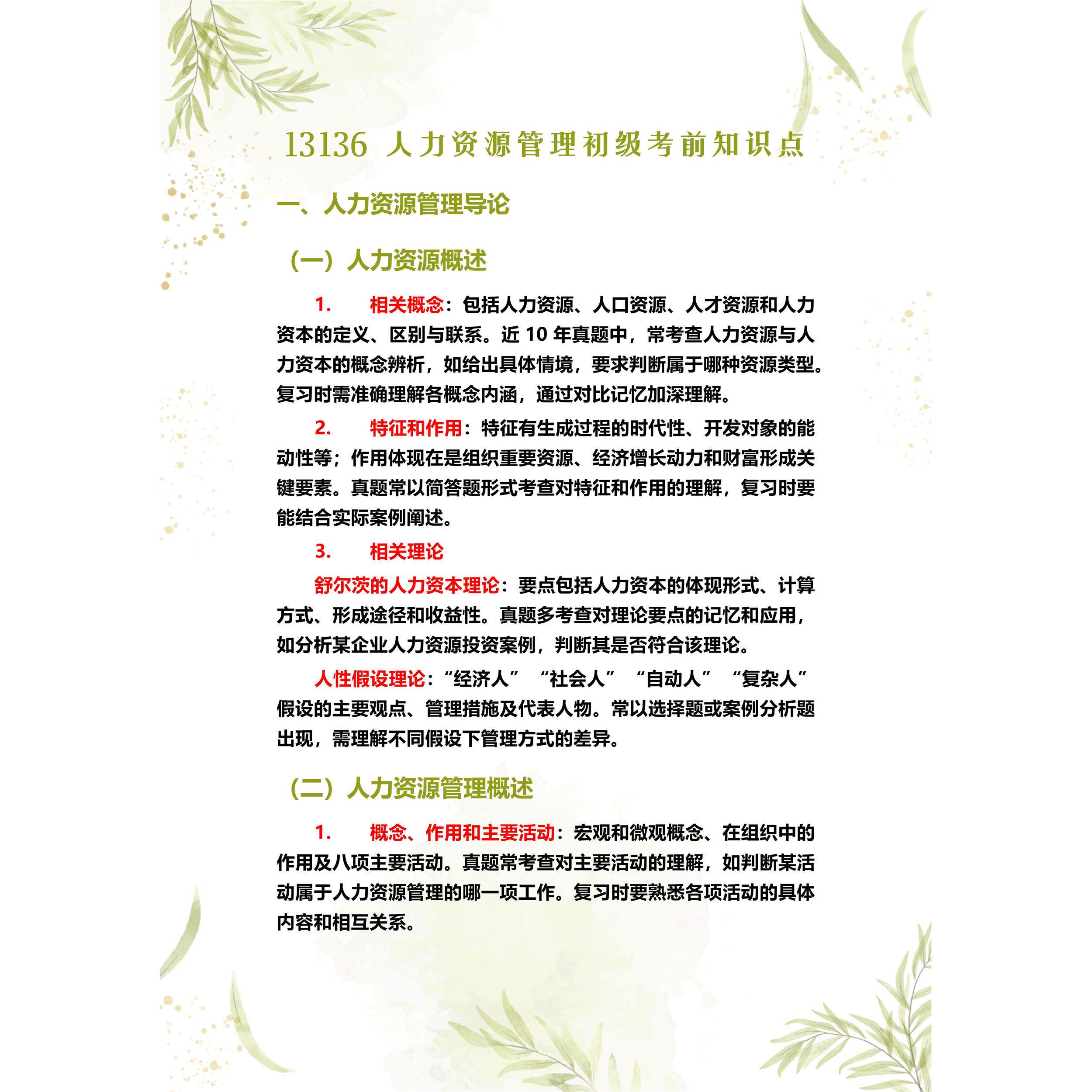 考点重点13136人力资源管理初级 考纲讲解自考笔记 资料 自考复习过关思维导图 精讲视频网课 考前押题资料