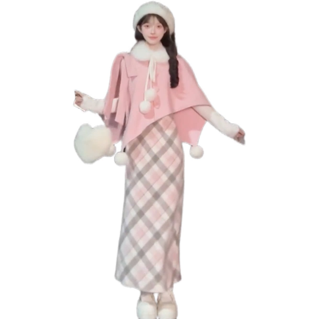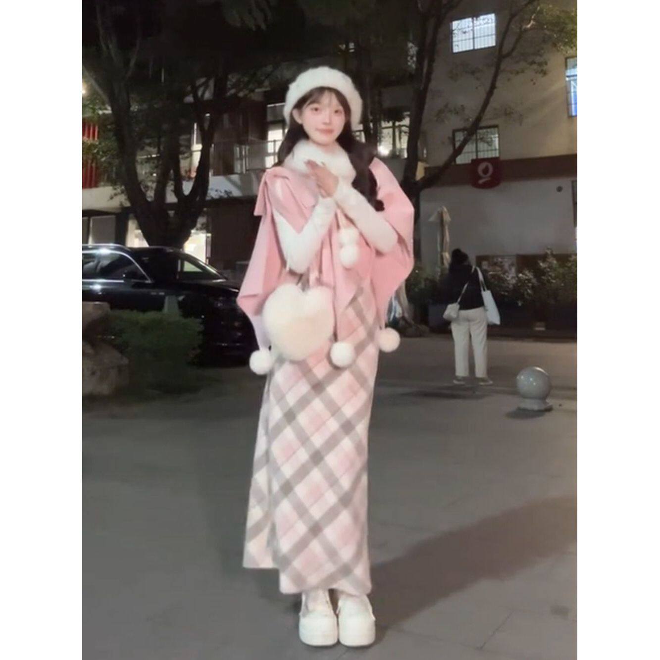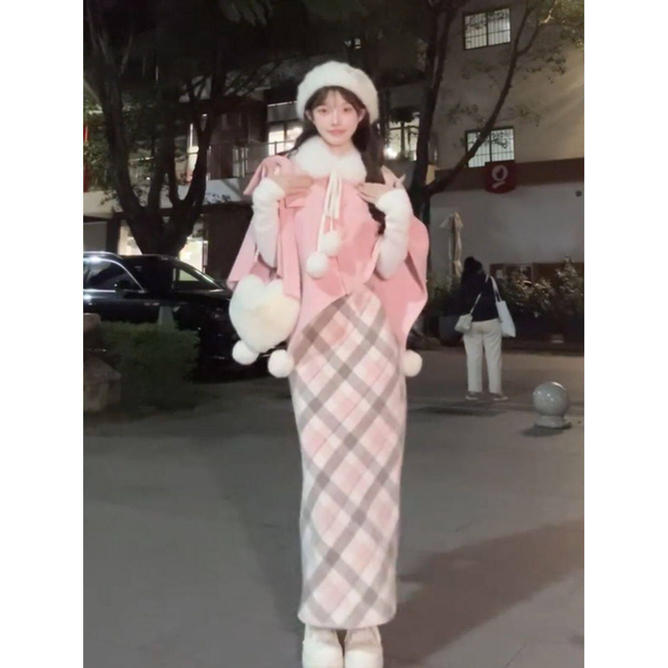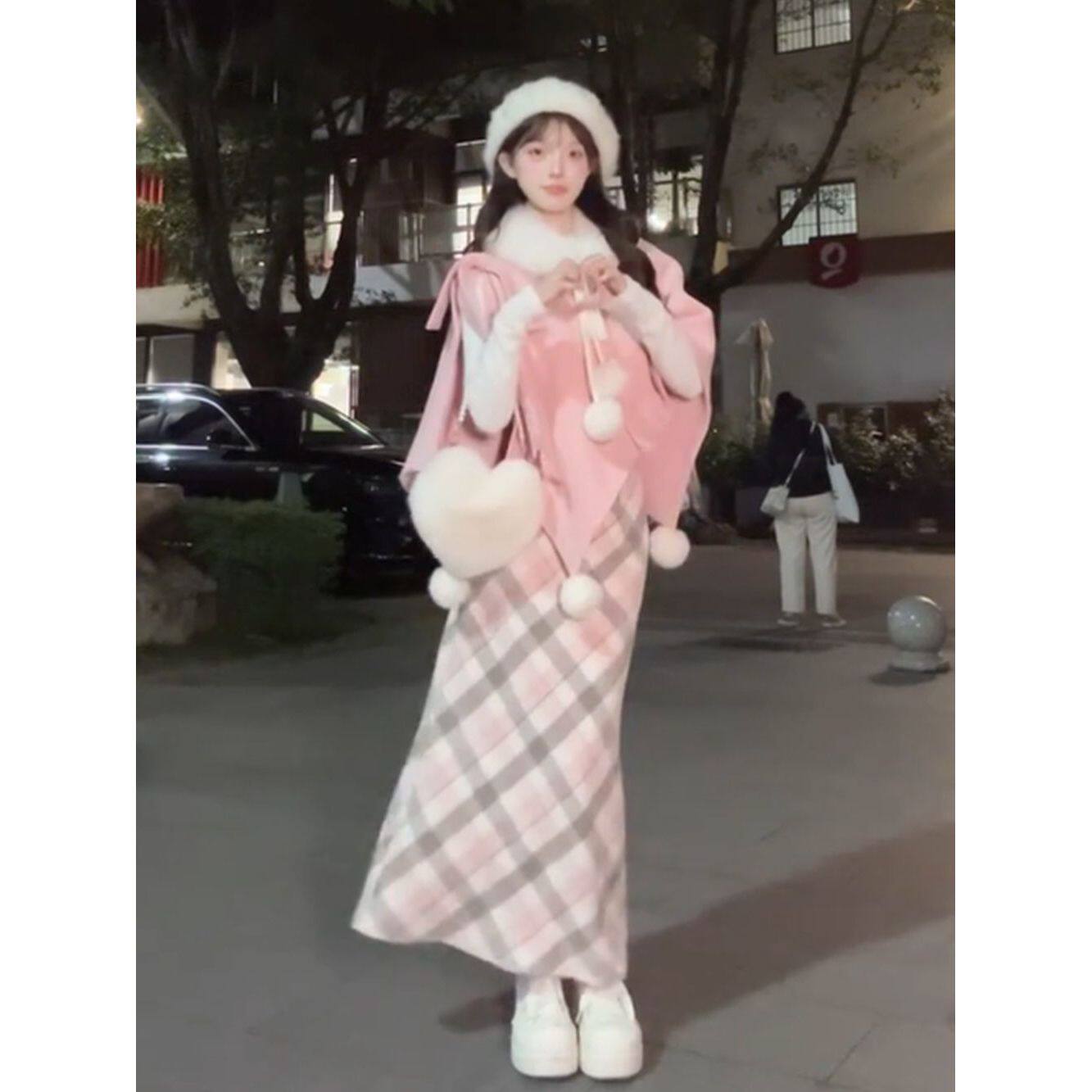 甜美可爱白色上衣+粉色斗篷+格纹半身裙三件套韩系百搭小众套装女