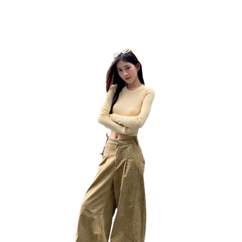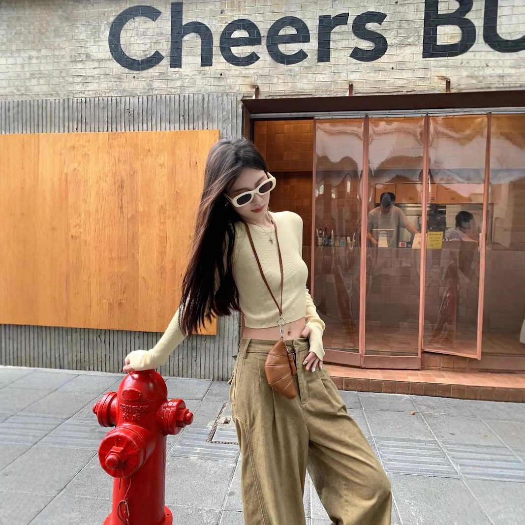 2024辣妹性感圆领修身显瘦长袖t恤早秋新款纯欲风小众百搭上衣ins