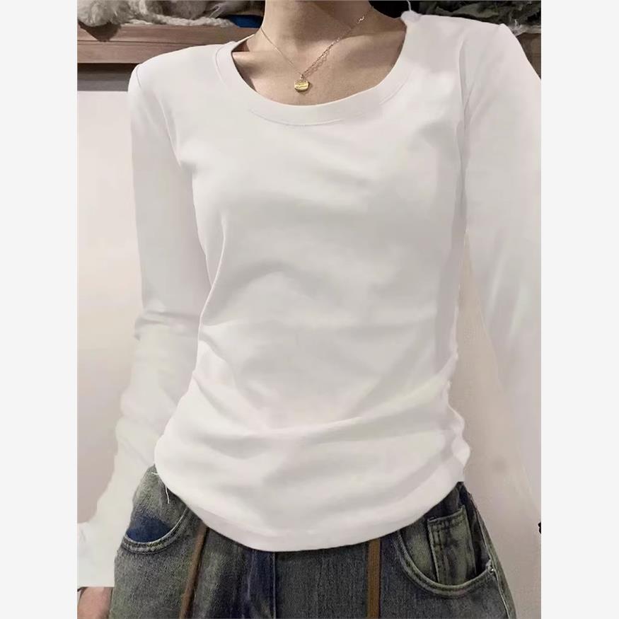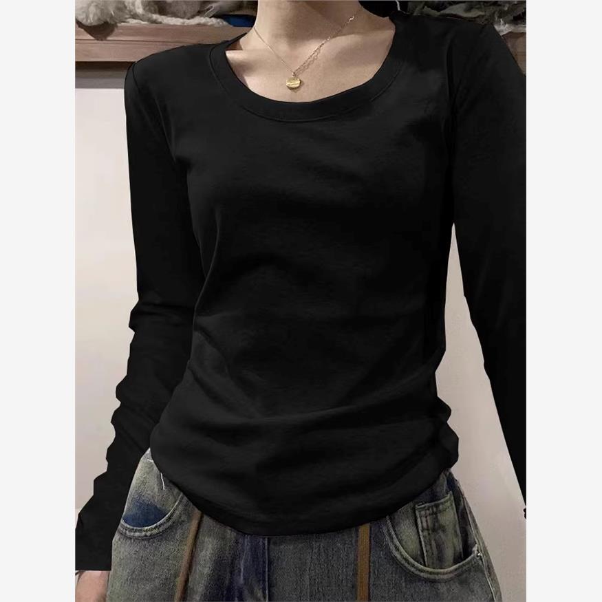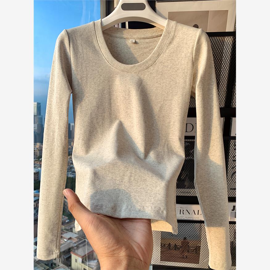 高级灰正肩U领长袖T恤女秋季新款纯色修身低领内搭打底衫上衣纯棉