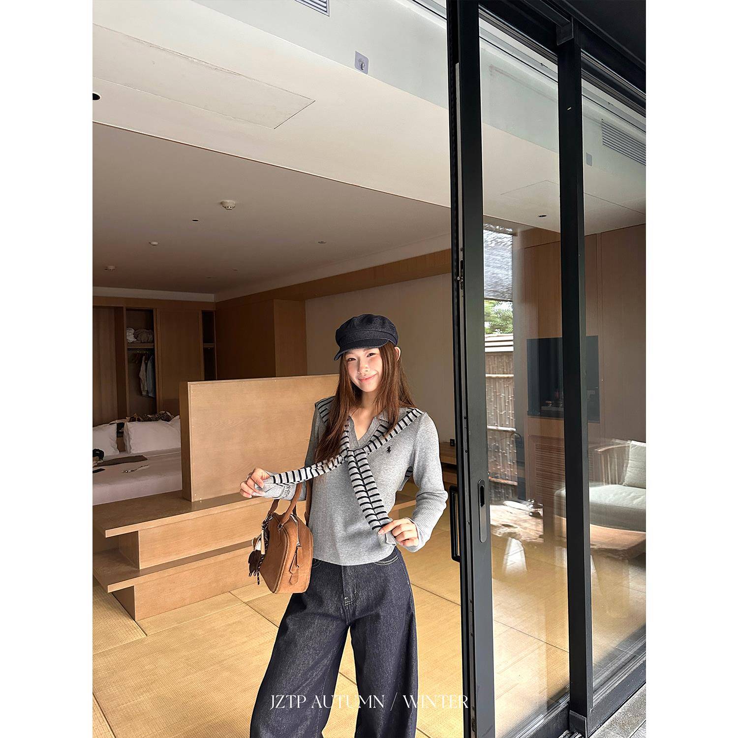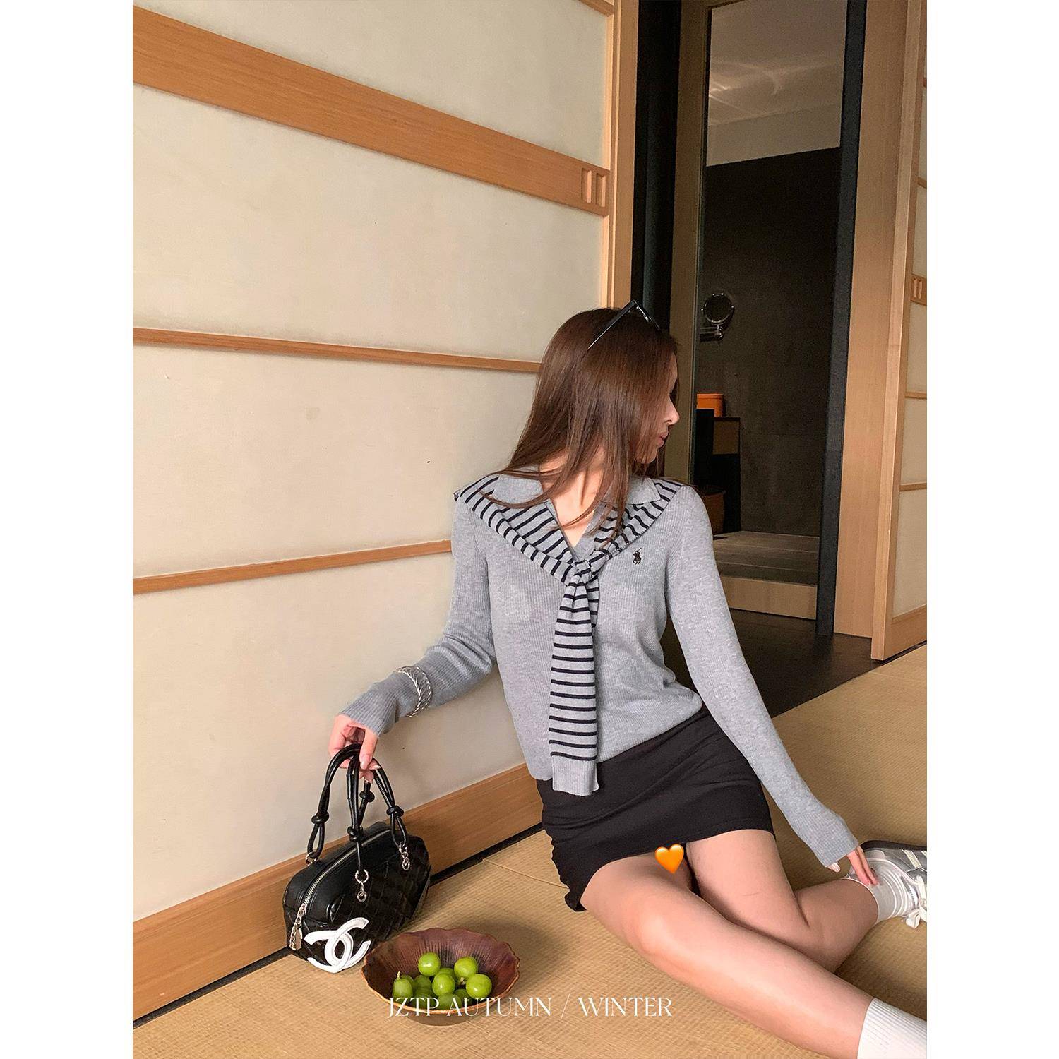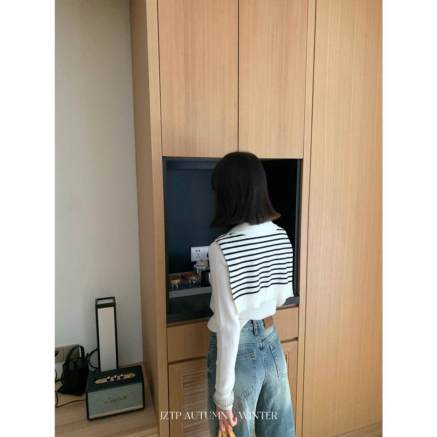 禁止桃跑【韩里韩气】秋冬新款针织开衫外套女+条纹披肩外搭上衣