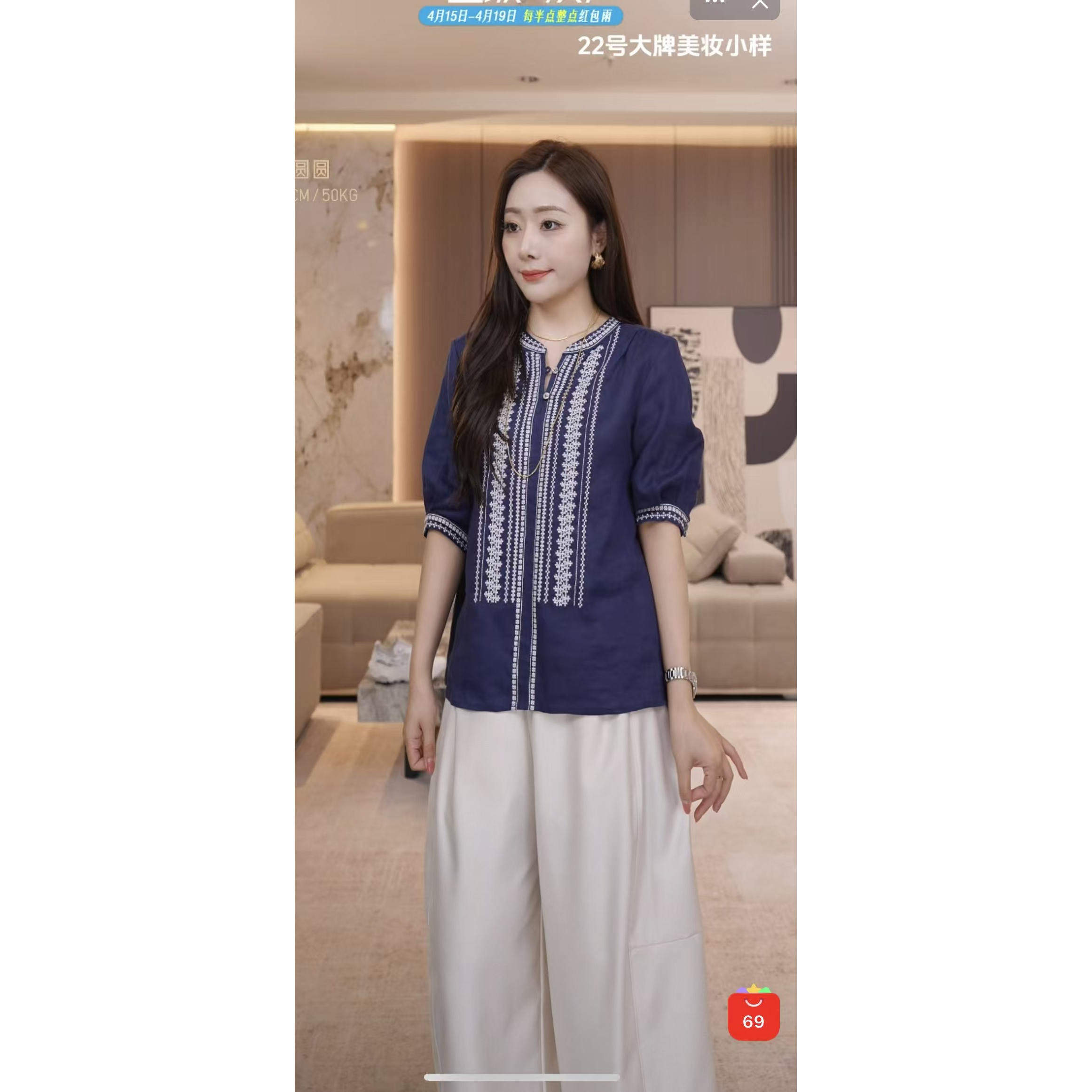 【YUAN】(衣长59)复古刺绣亚麻衬衫女七分袖圆领