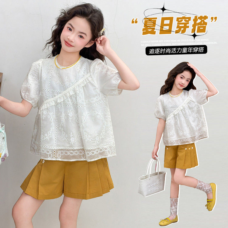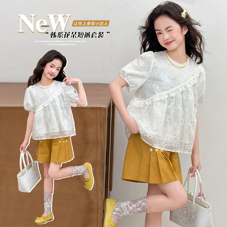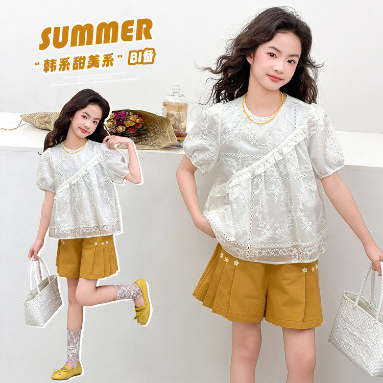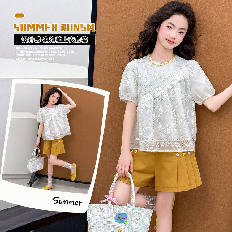 女童夏装波点娃娃衫套装洋气泡泡袖上衣短裤两件套