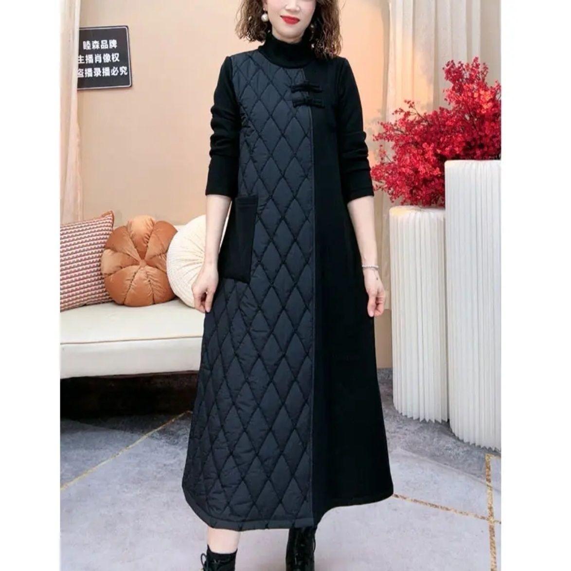 加绒加厚冬季半高领复古新中式连衣裙优雅气质设计中老年复古长裙