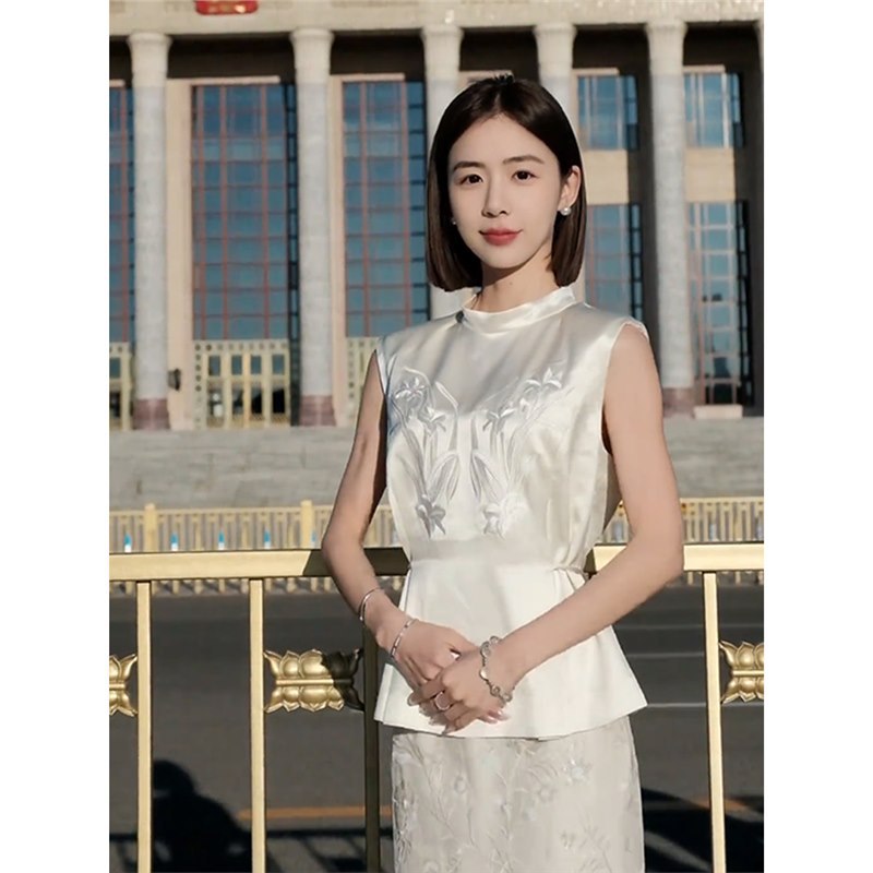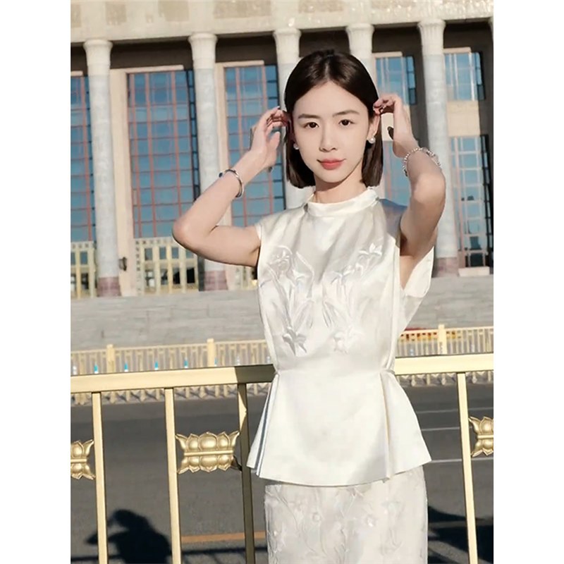 气质优雅女夏季新中式国风减龄漂亮洋气白色宋锦醋酸连衣裙套装