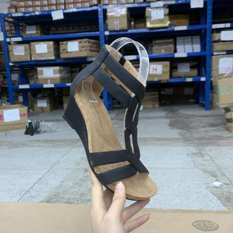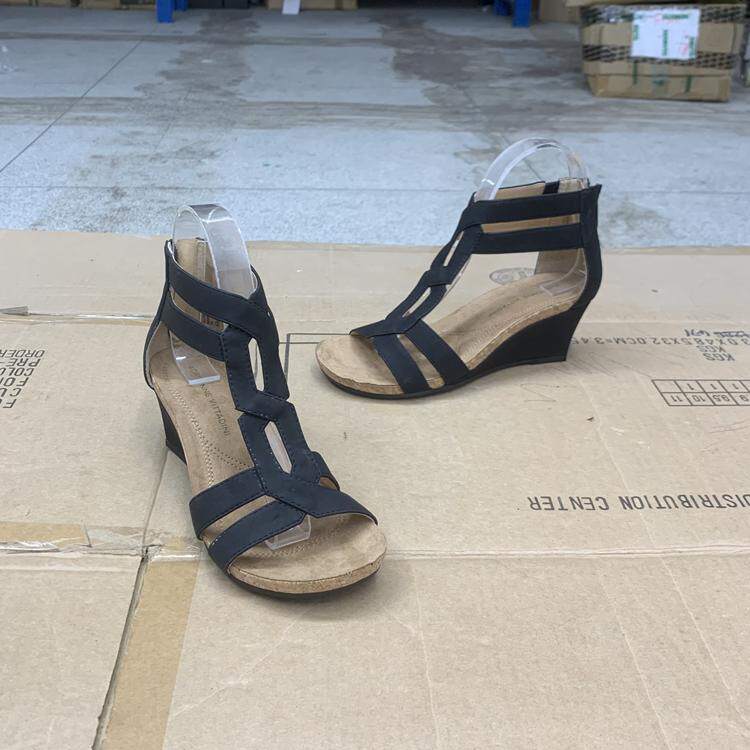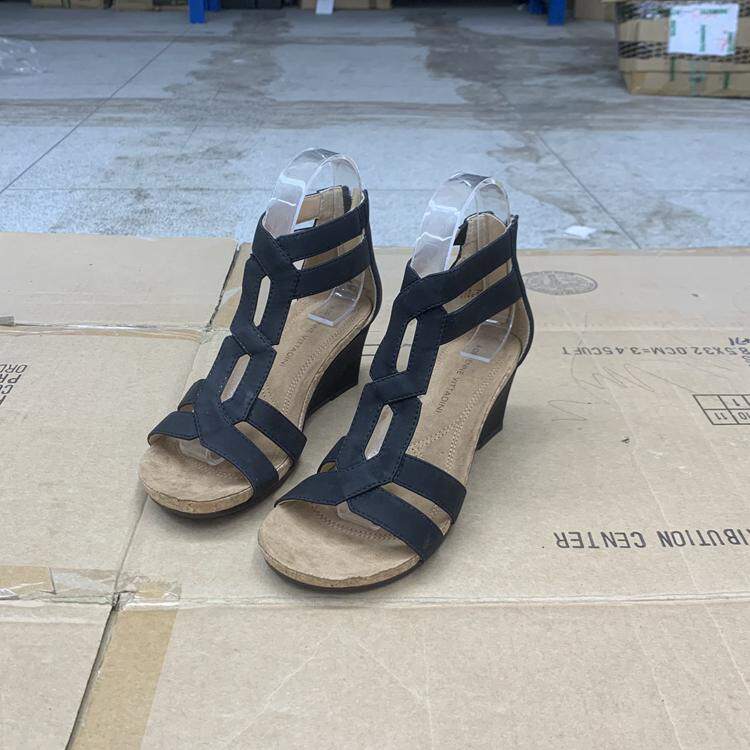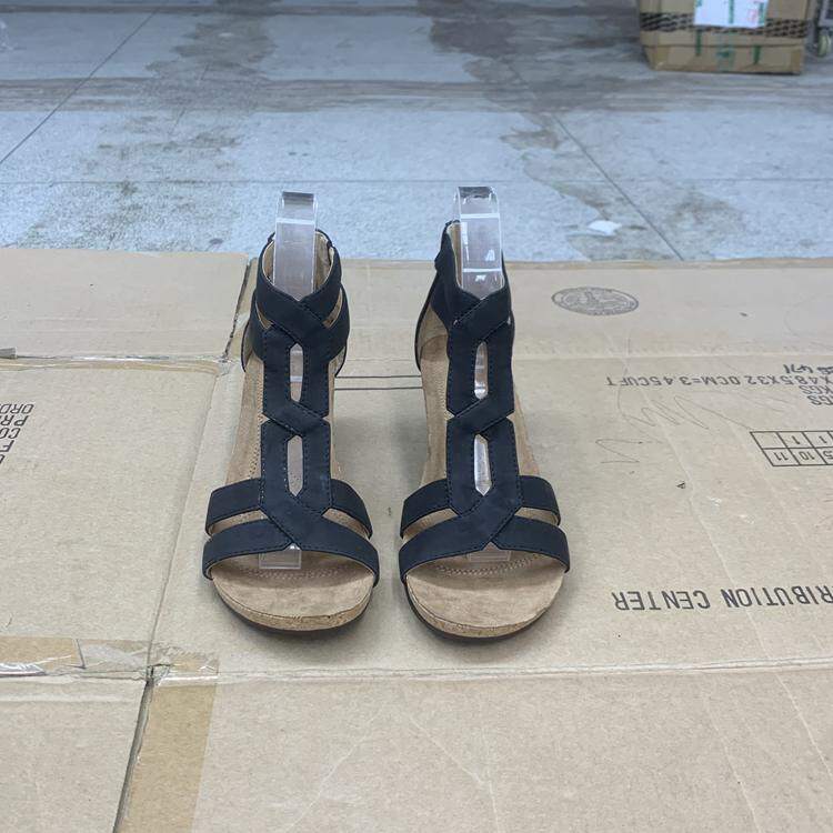 外贸女鞋原单年新款纯色休闲百搭圆头坡跟包跟露趾凉鞋