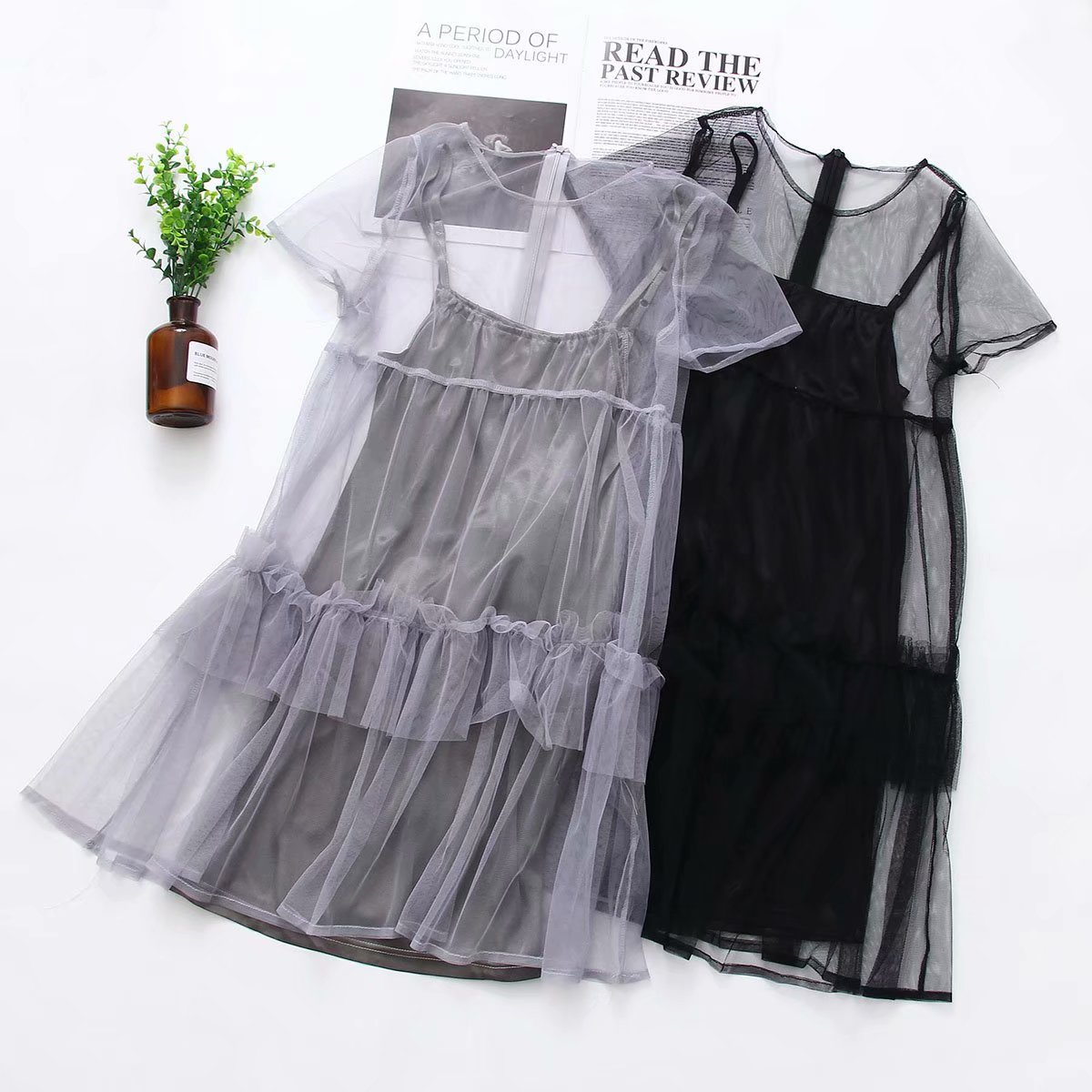 厂家直售新品ins超火两件套百搭显瘦网纱连衣裙女花边洋气裙子潮