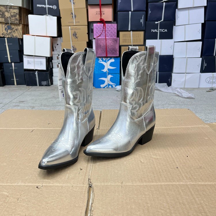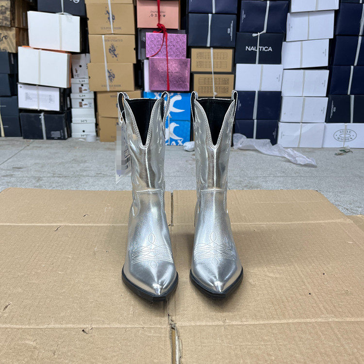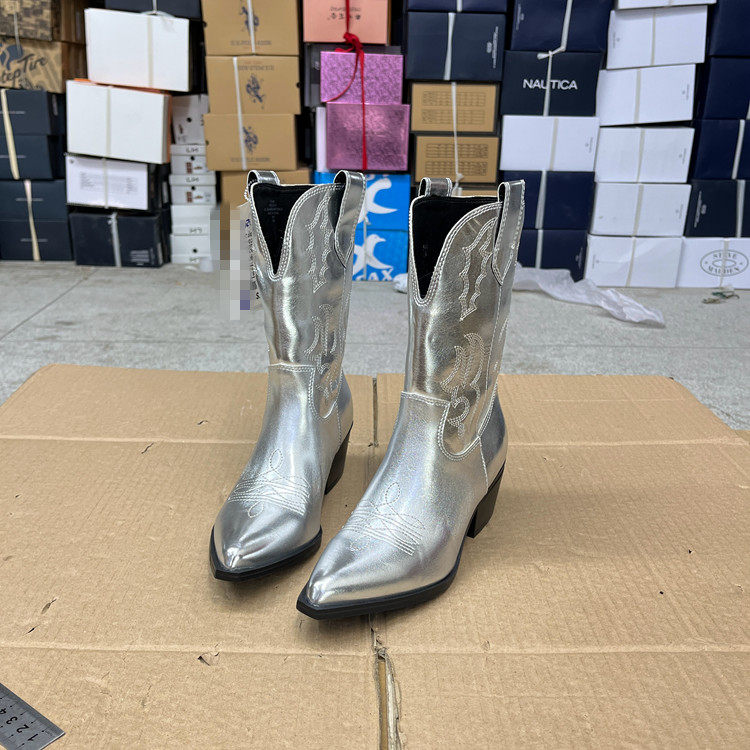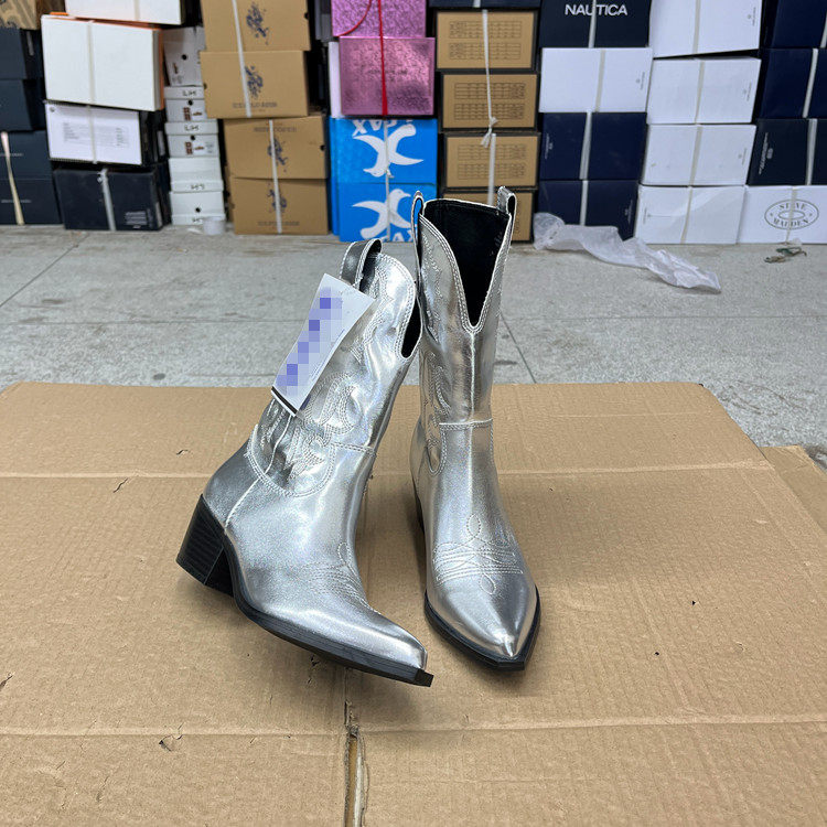 外贸原单秋季欧美时尚百搭新款西部牛仔尖头粗跟短靴户外骑士靴