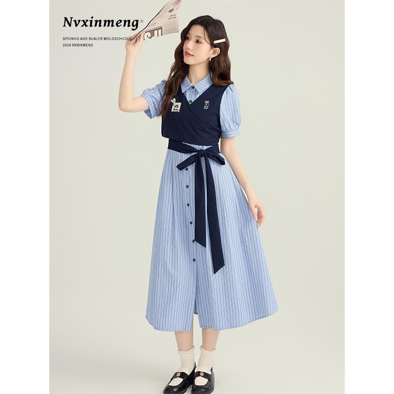 女心萌美式学院风条纹连衣裙2025新款女夏季小个子假两件衬衫裙子