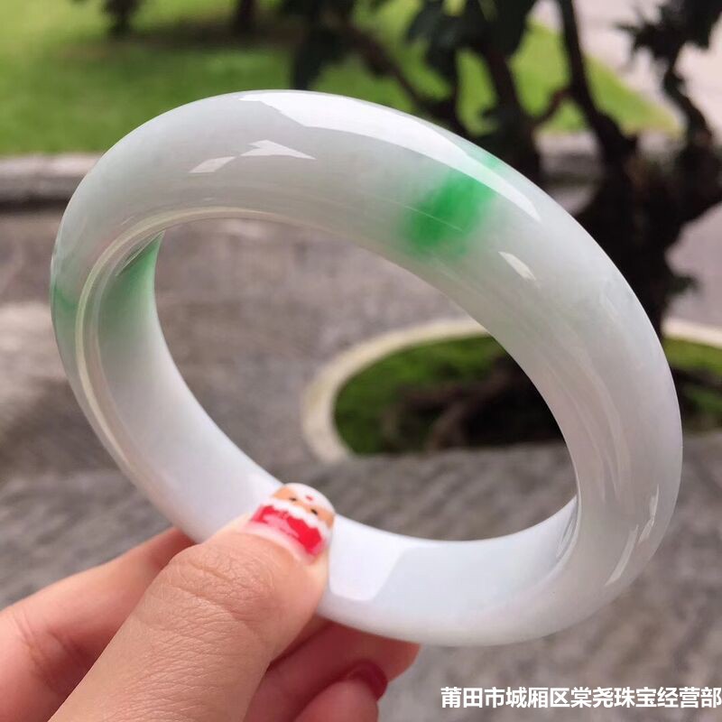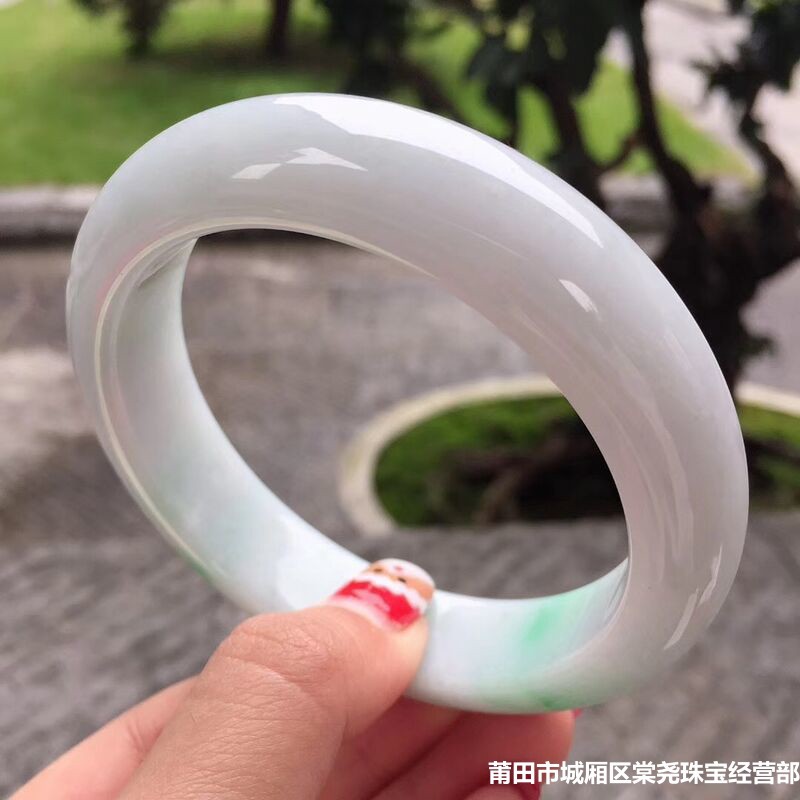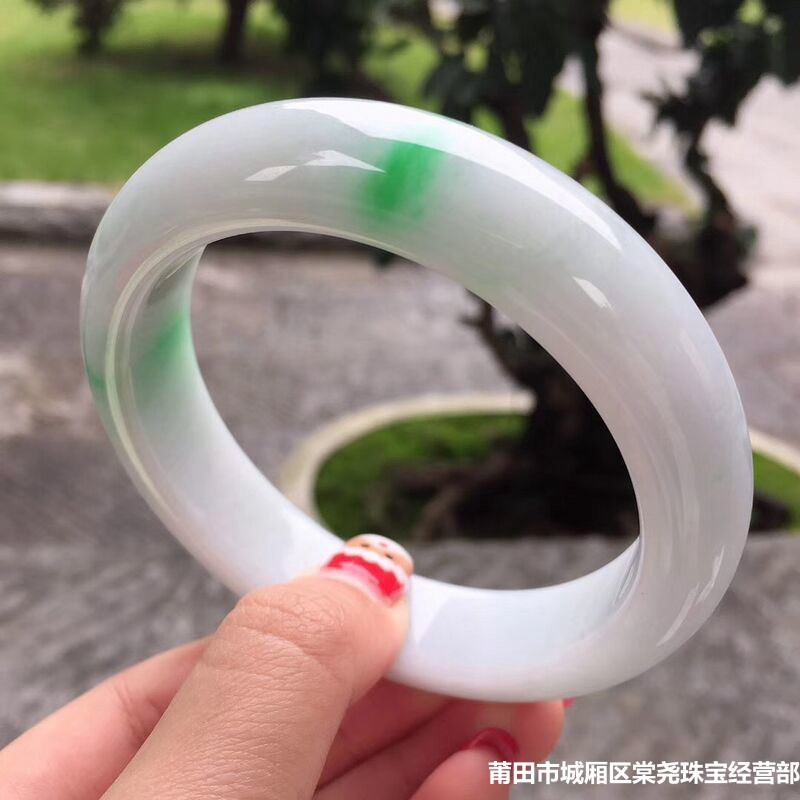 天然缅甸翡翠手镯飘阳绿白底青双彩宽边正圈翡翠手镯玉石女款