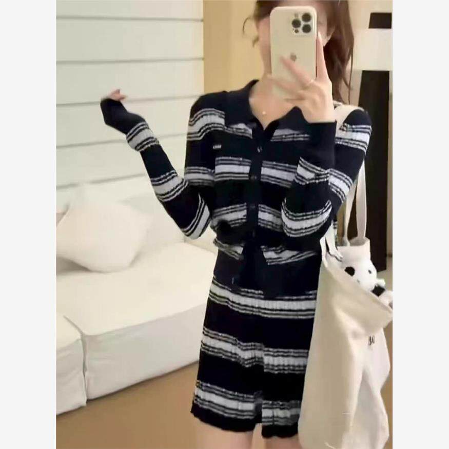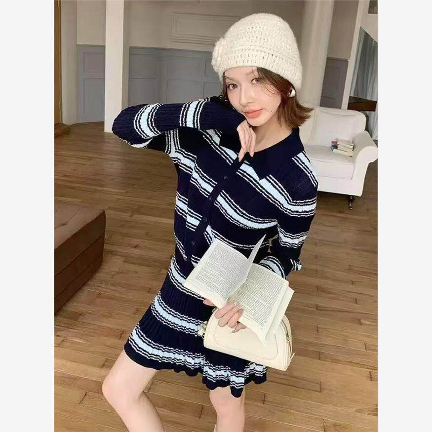 入秋穿搭一整套2025韩系独特超好看小个子针织条纹连衣裙子套装女