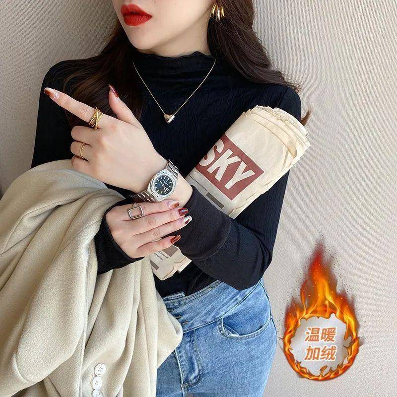 木耳边半高领蕾丝加绒打底衫女纱衣春秋冬新款洋气内搭小衫上衣潮