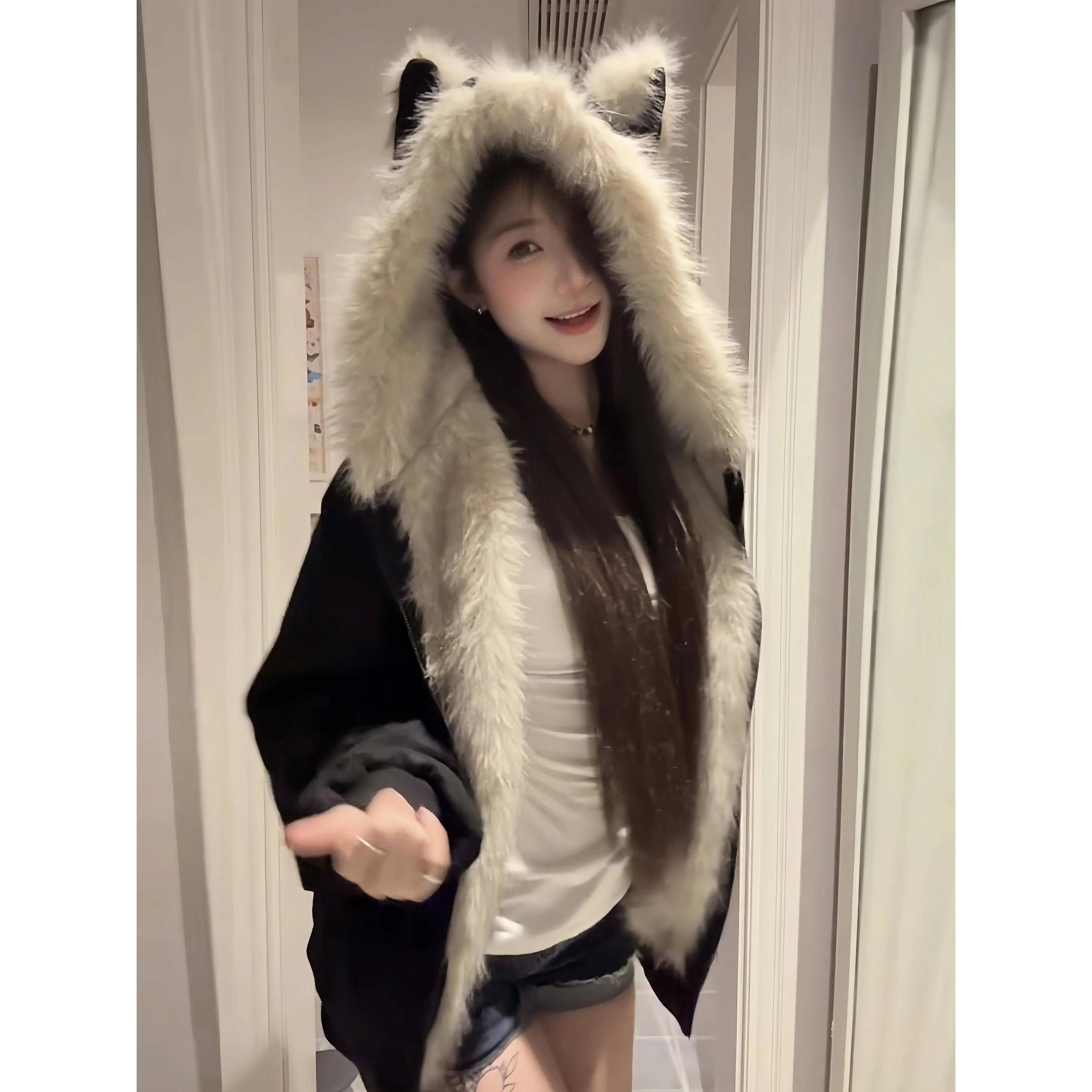 座山雕麂皮猫耳朵连帽棉服外套男女冬季新款国潮毛领加绒加厚棉衣