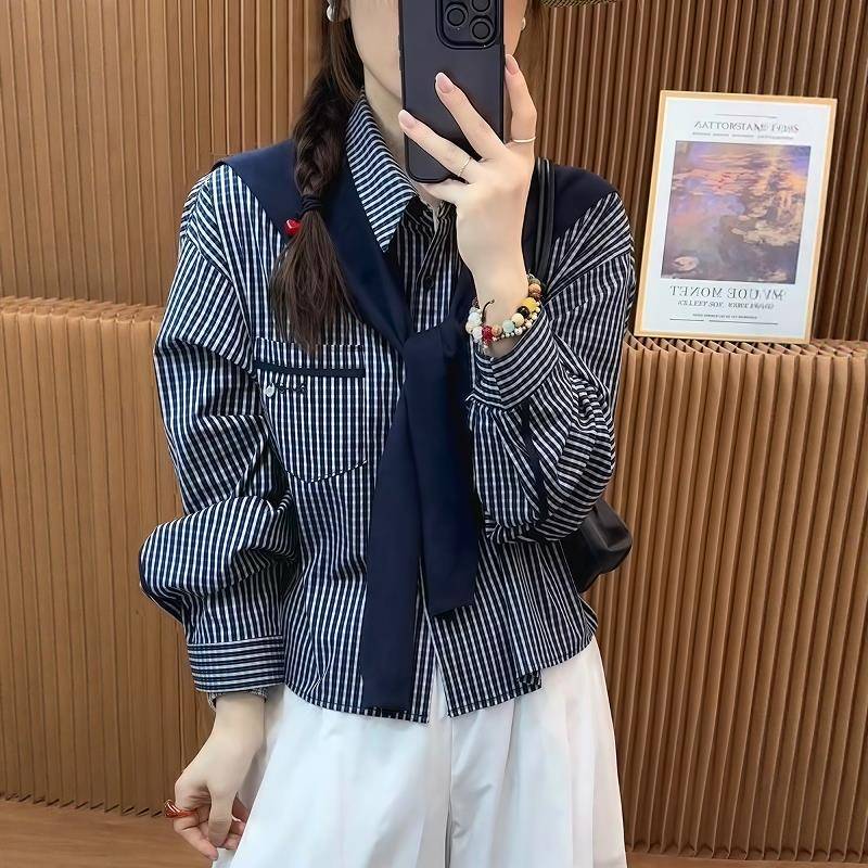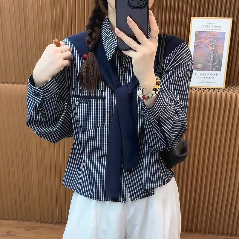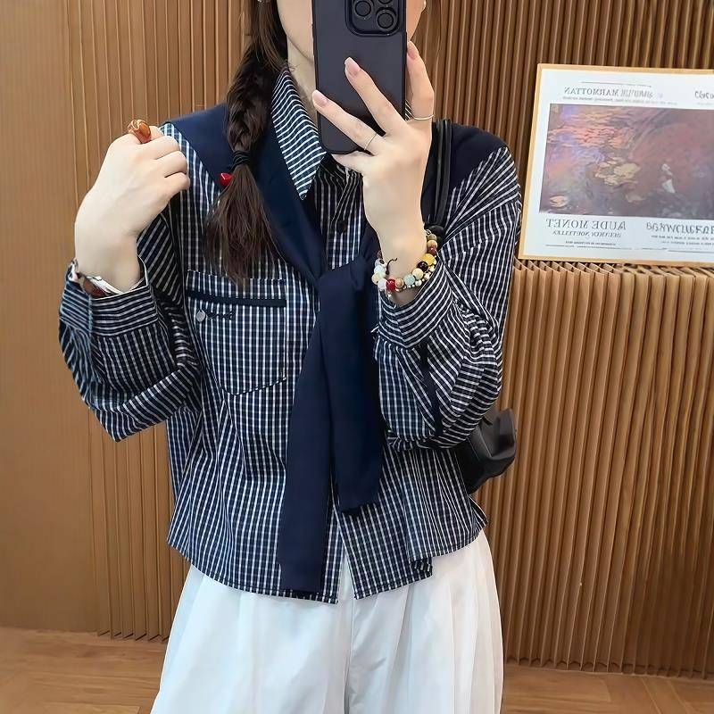 韩系减龄披肩长袖蓝色格子衬衫女2025秋新款高级感洋气设计感上衣