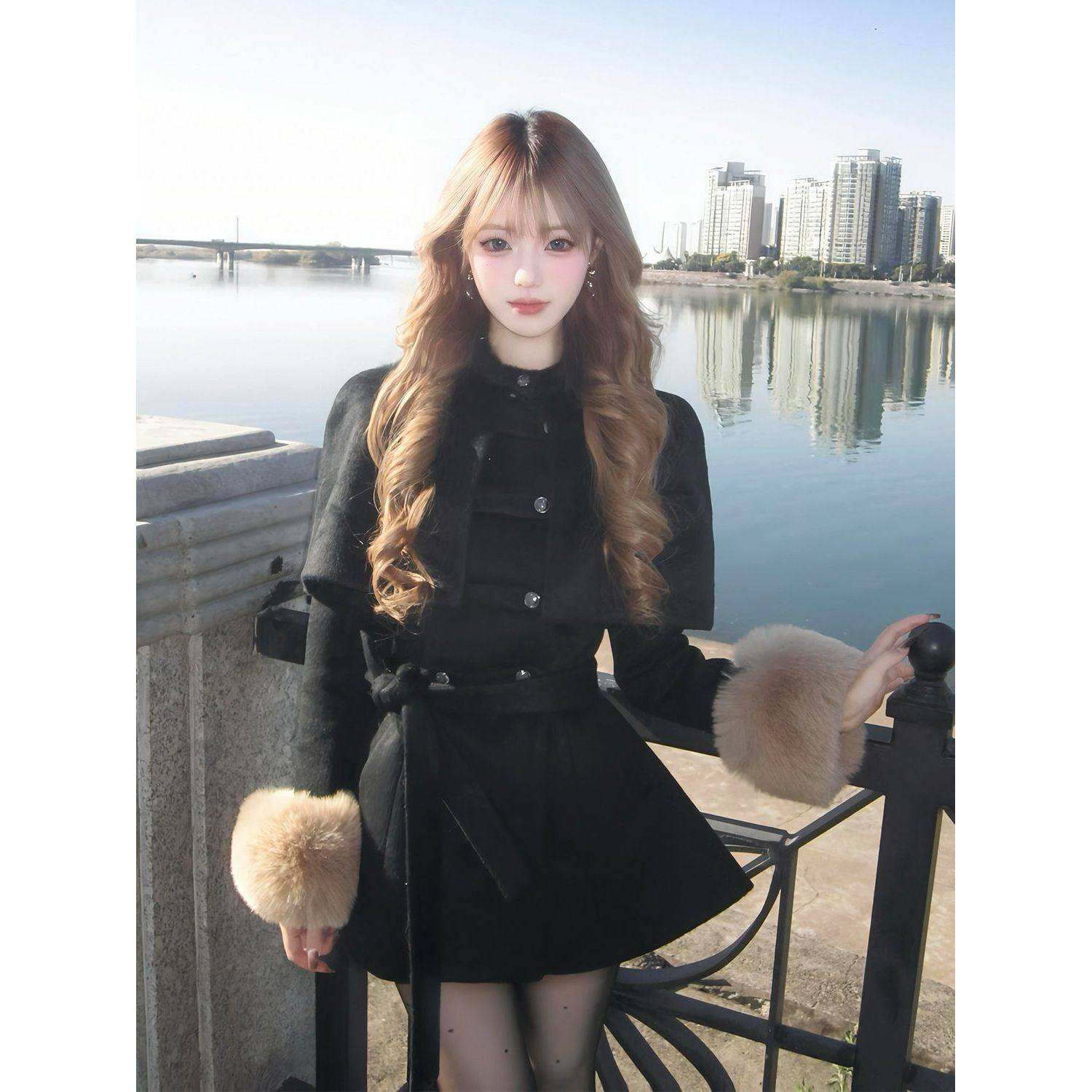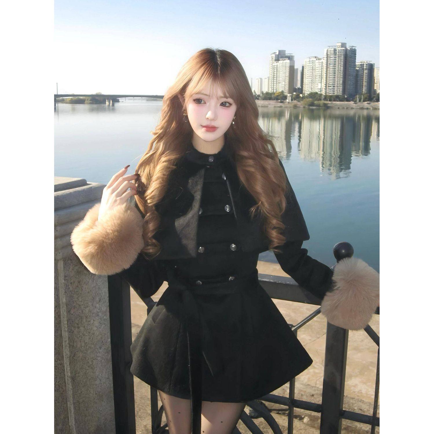财阀千金 冬季新款小香风斗篷披肩+收腰毛呢外套气质修身两件套女