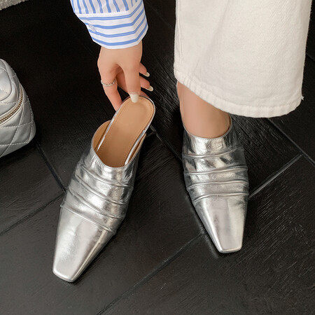 早春时髦精~3cm坡跟包头半拖鞋女春秋外穿褶皱穆勒鞋方头凉拖