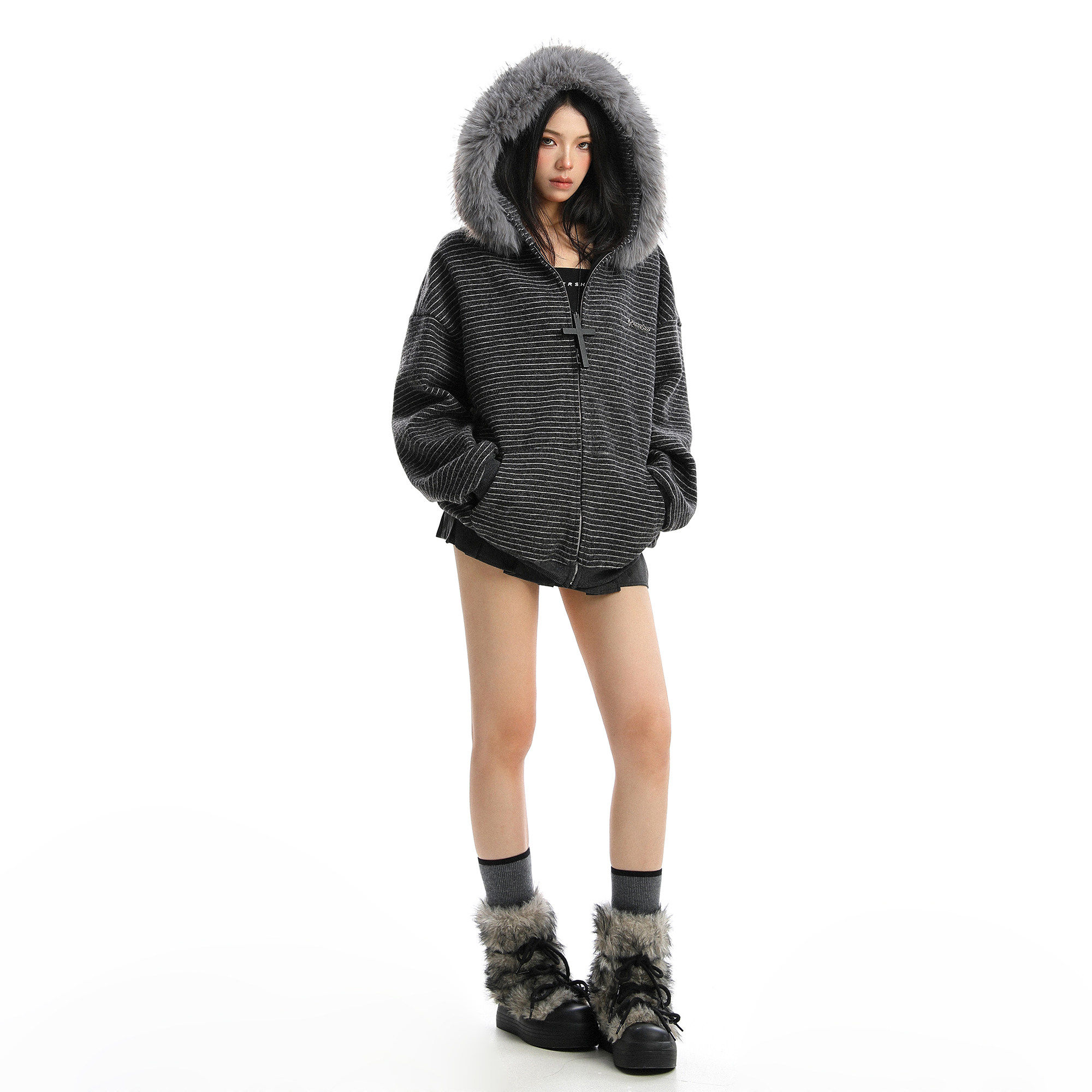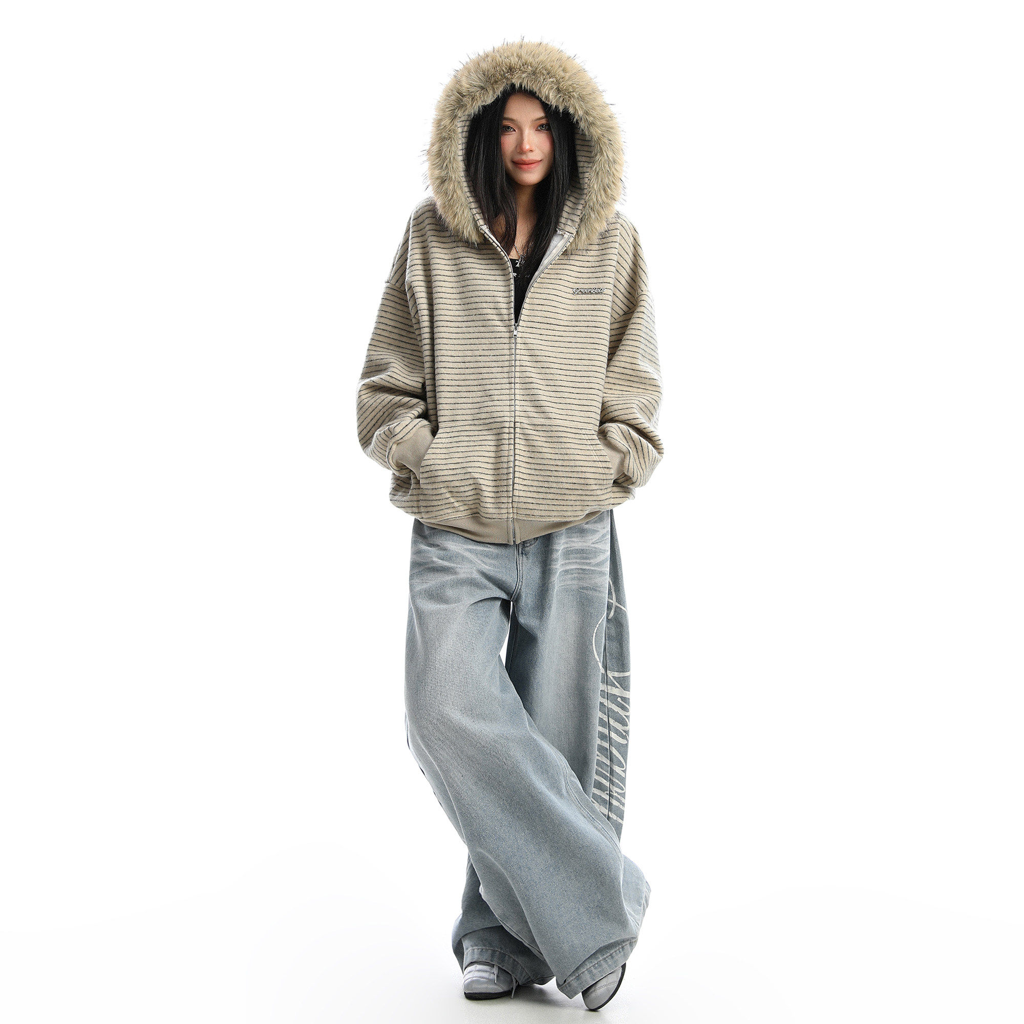 75折NEW美式条纹可拆卸大毛领连帽卫衣女情侣秋季慵懒风潮牌外套