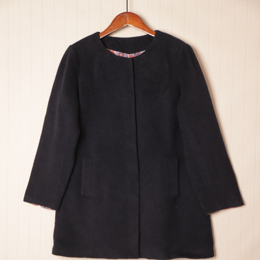 秋冬Vintage复古英伦风拼接色羊毛呢子大衣 D64