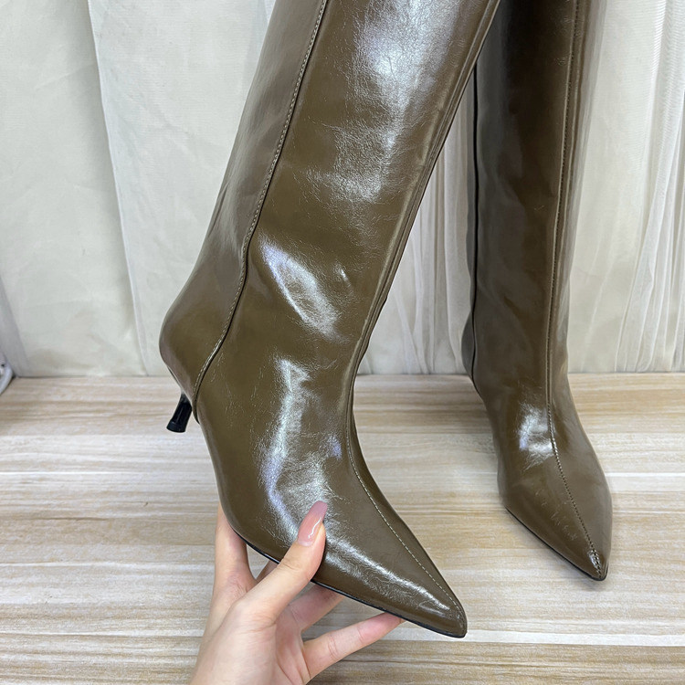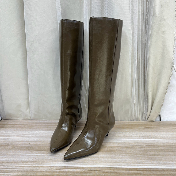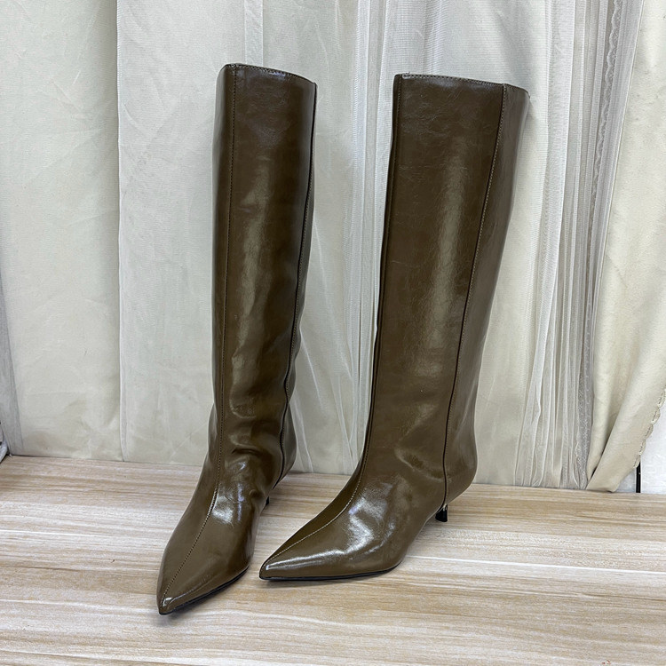 外贸原单尖头妞跟长靴简约时尚新款欧美风气质百搭个性卡其绿女靴