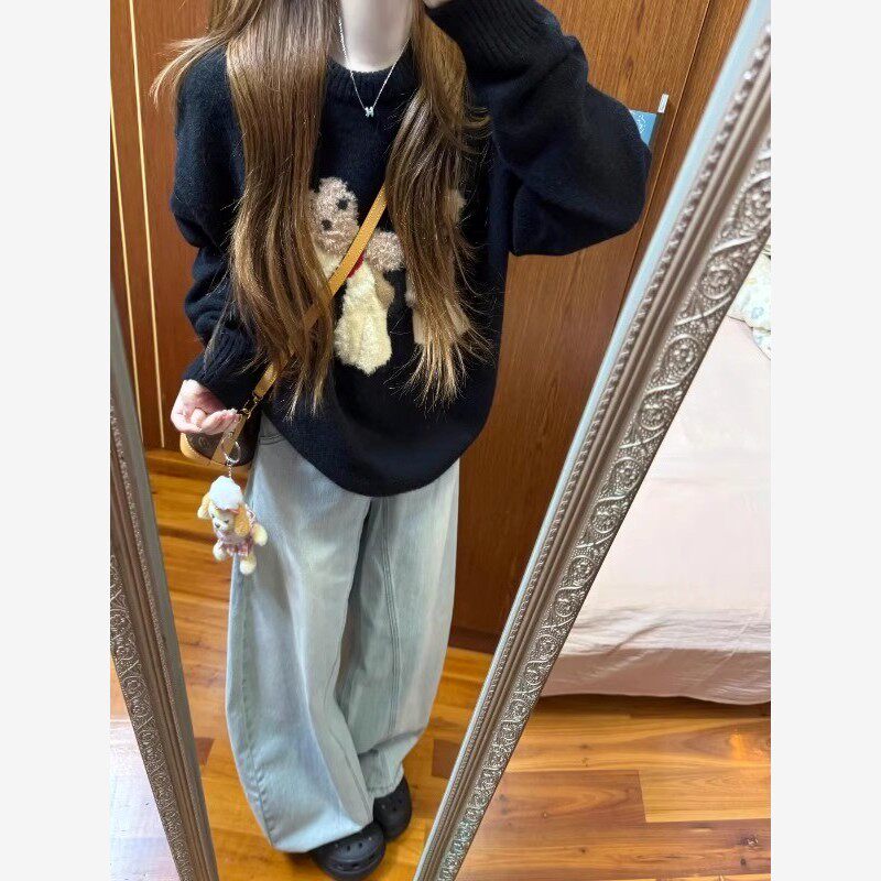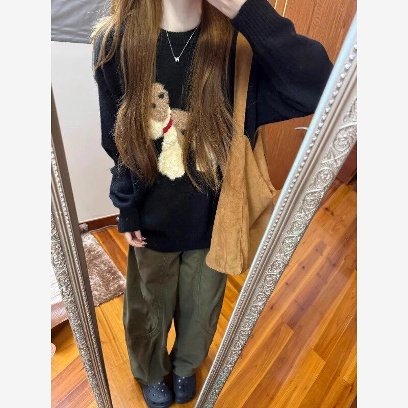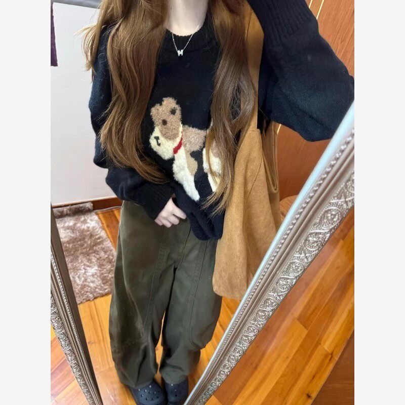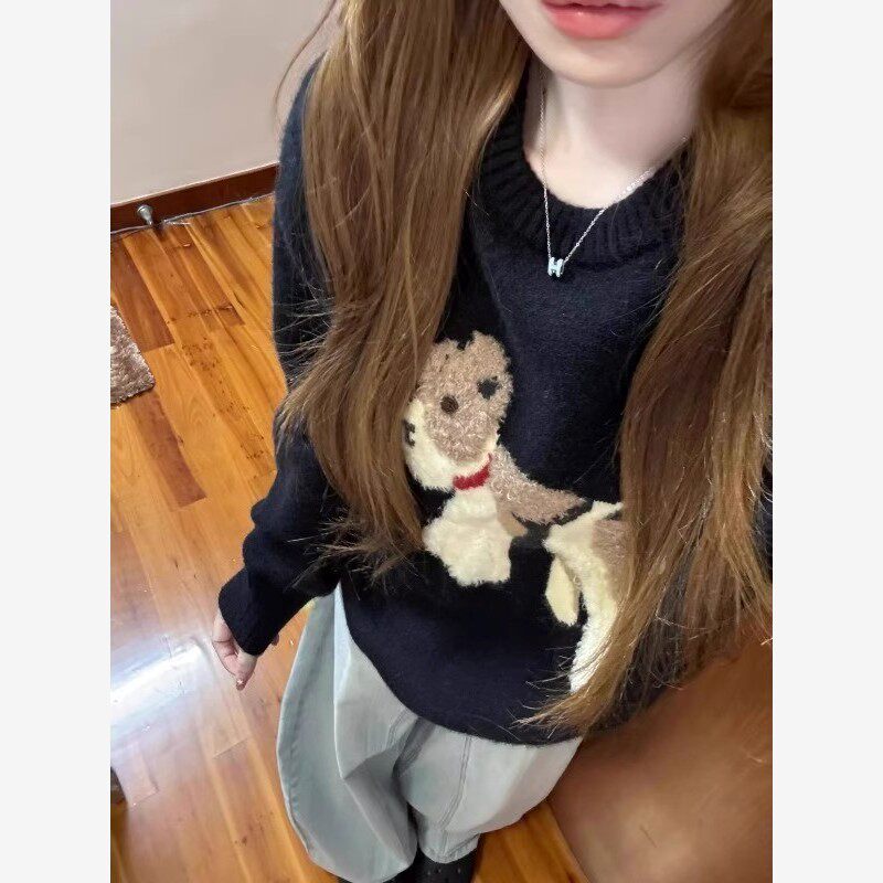 国潮牌秋冬新款针织衫女休闲宽松时尚毛绒小狗提花毛衣慵懒风上衣