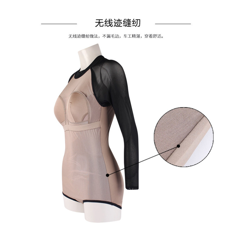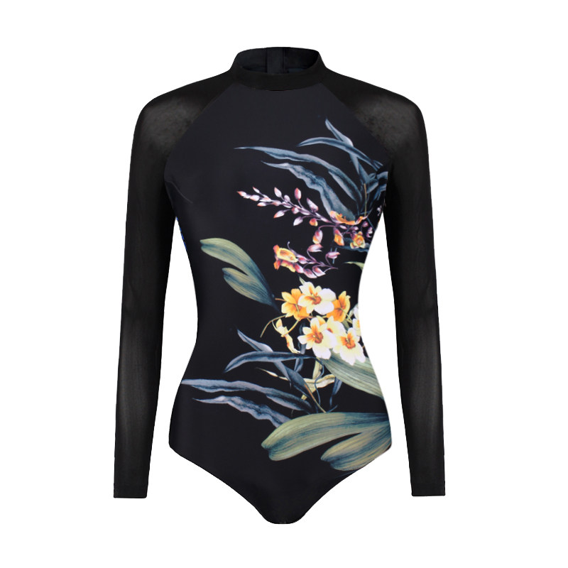 凯迪龙连体三角长袖游泳衣女防晒性感温泉黑印花保守遮肚拉链泳装