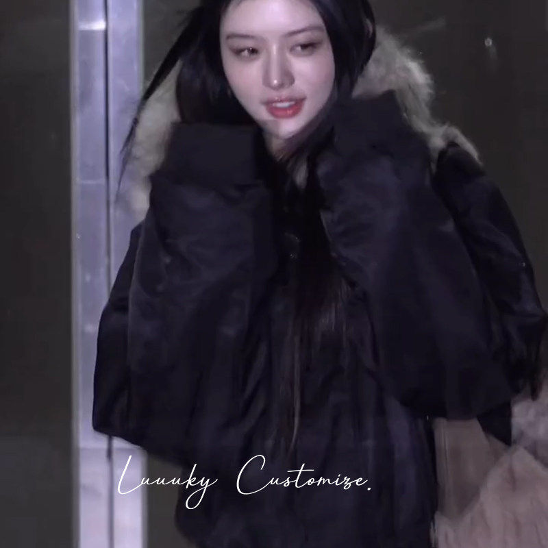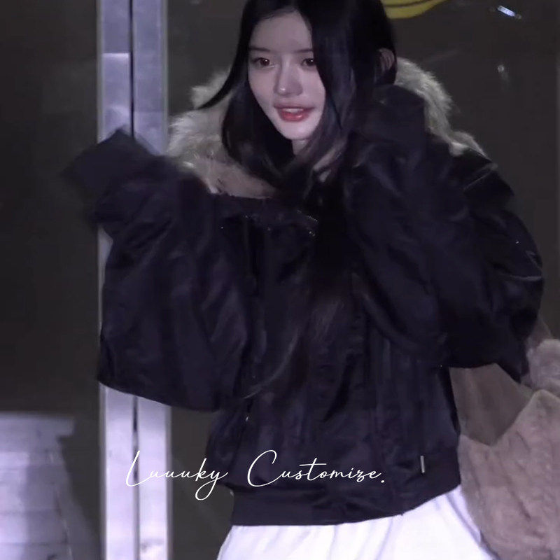 Minju朴敏珠同款黑色大毛领加厚夹克棉服外套女冬短款设计感棉衣