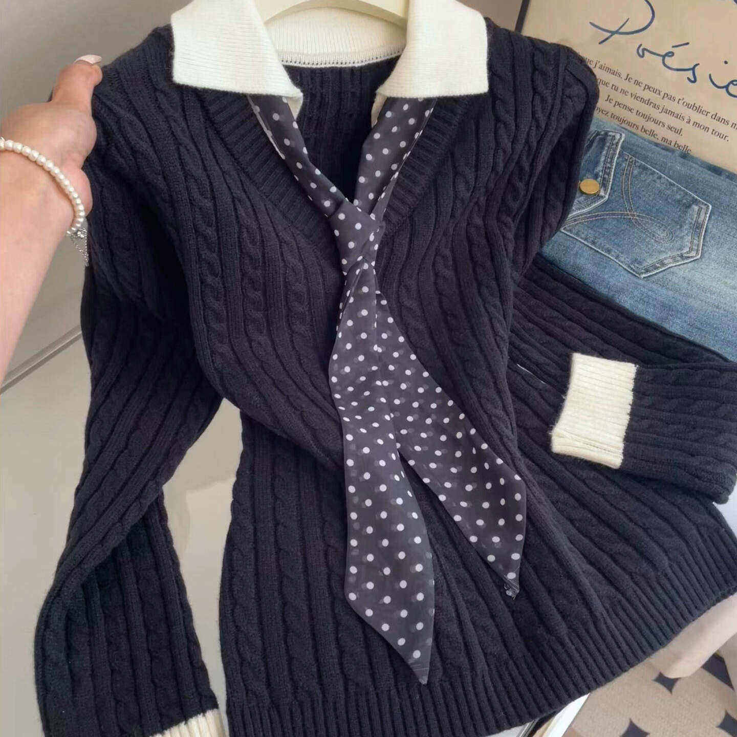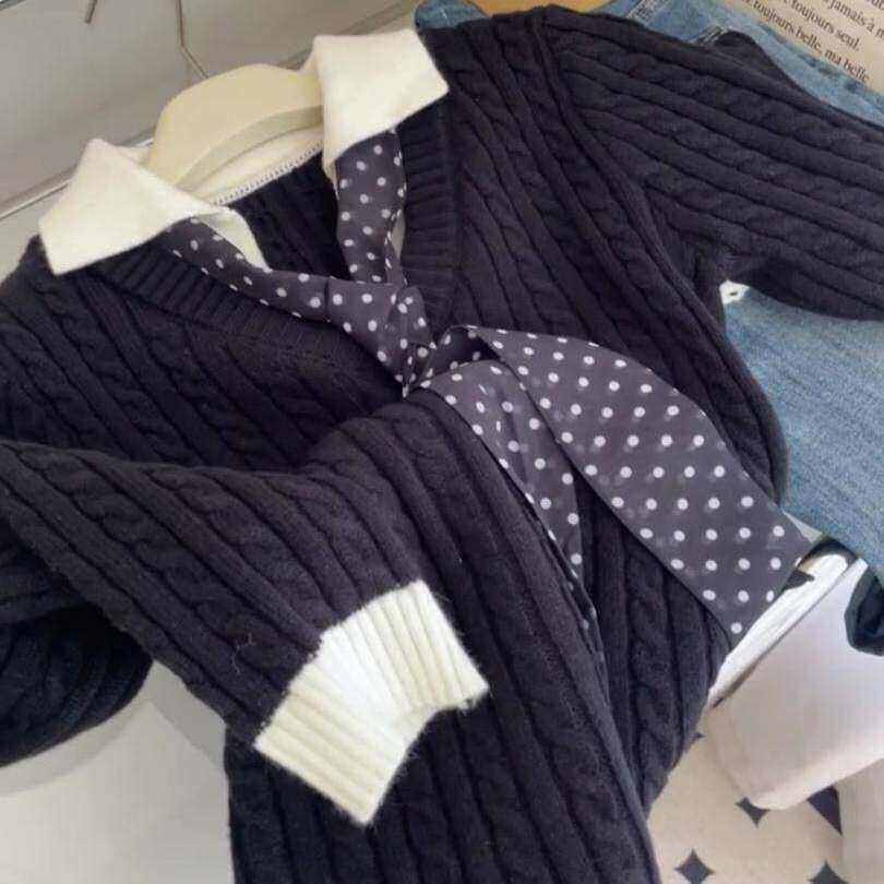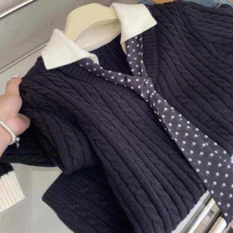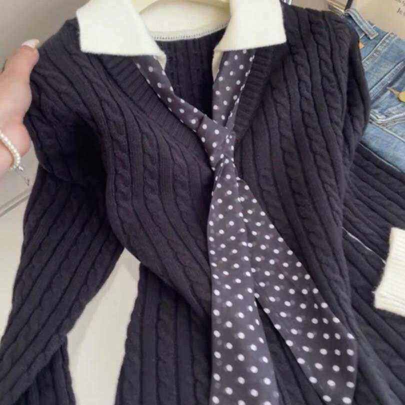韩系设计感黑色拼色假两件波点领带长袖针织衫女绝美内搭毛衣上衣