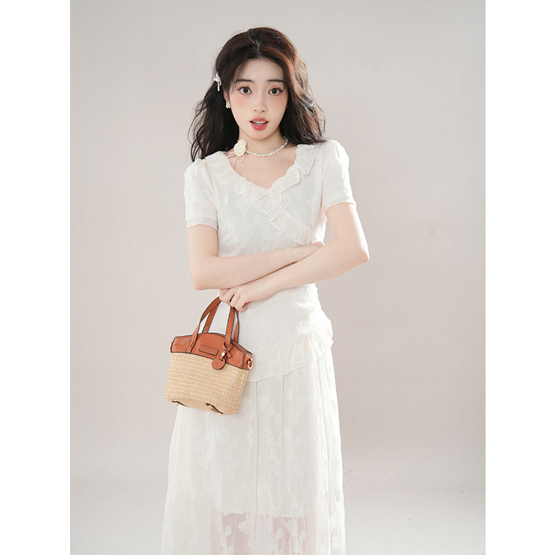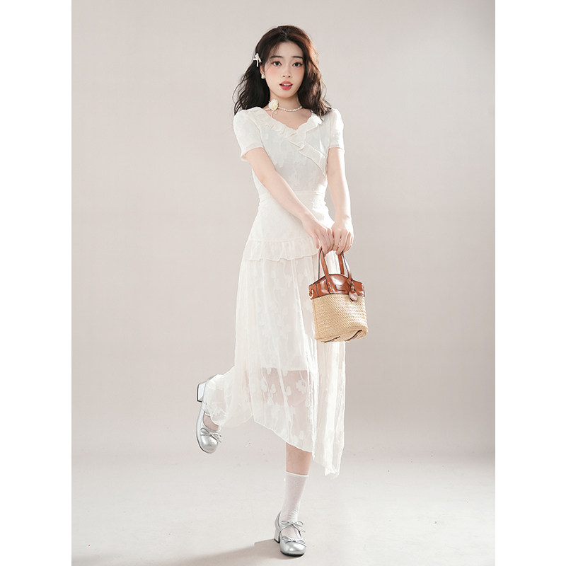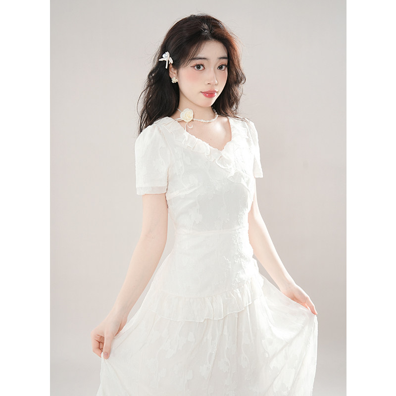 2024夏新款法式方领设计感小众气质荷叶边收腰显瘦不规则连衣裙女