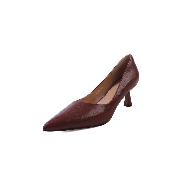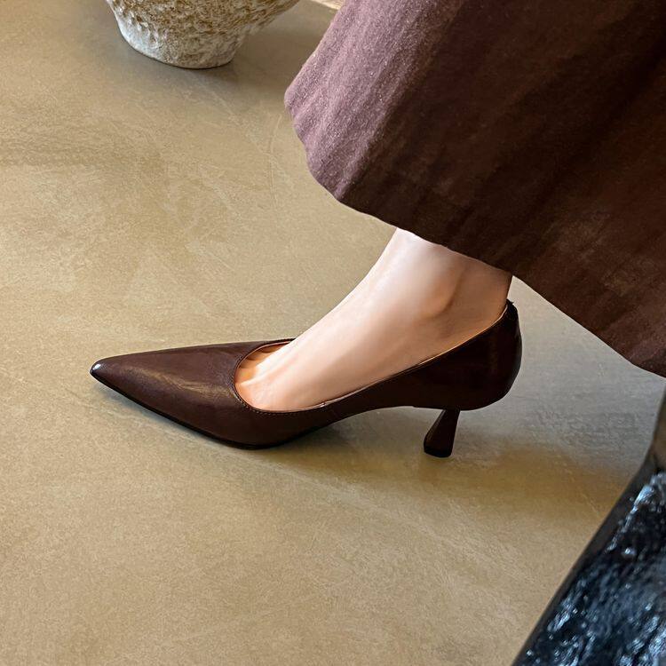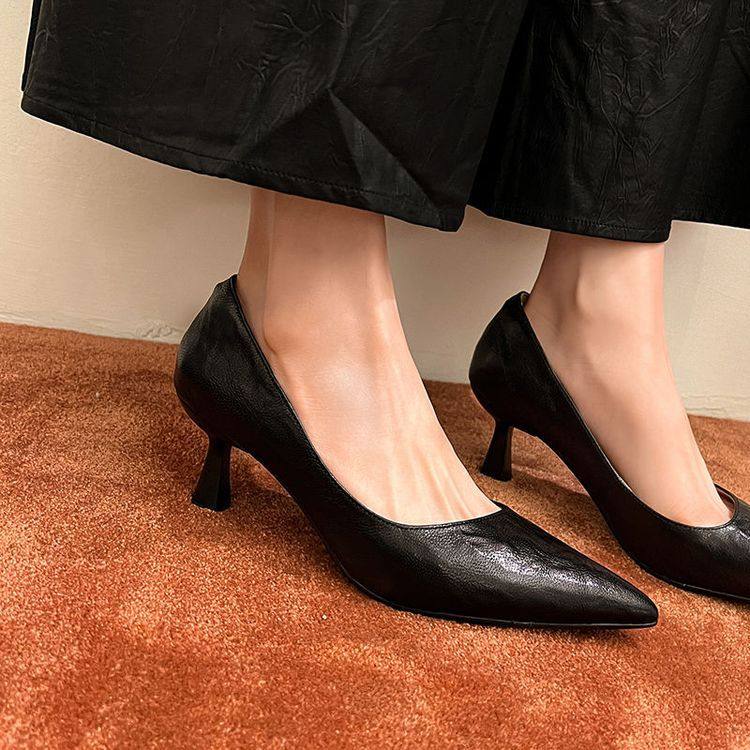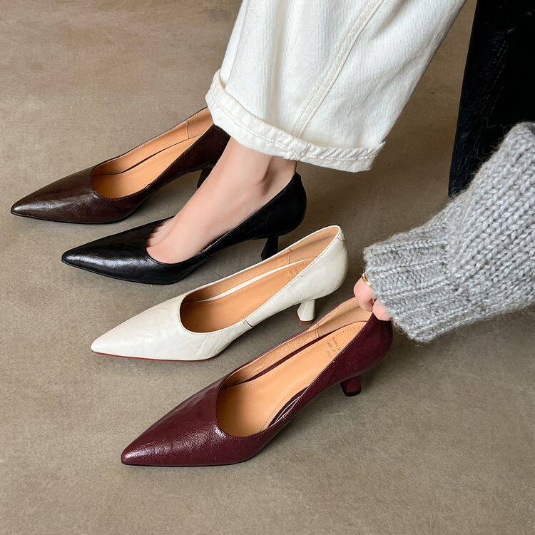 尖头酒红色高跟鞋女细跟黑色春季法式猫跟鞋通勤舒适超软羊皮单鞋