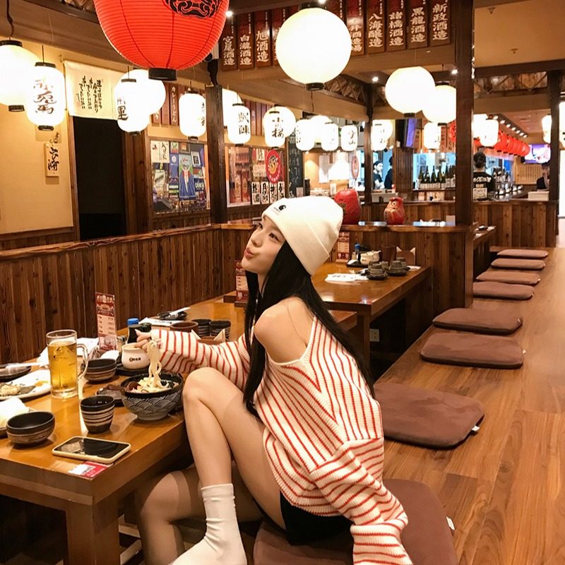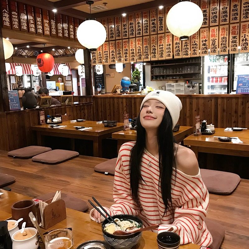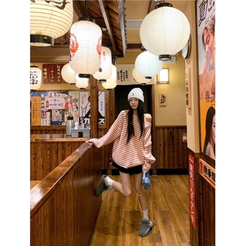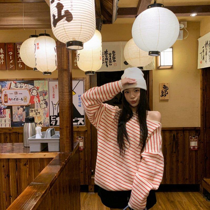 首页> 女装> 红白条纹斜肩长袖毛衣慵懒高级感针织衫女冬季宽松休闲露肩上衣