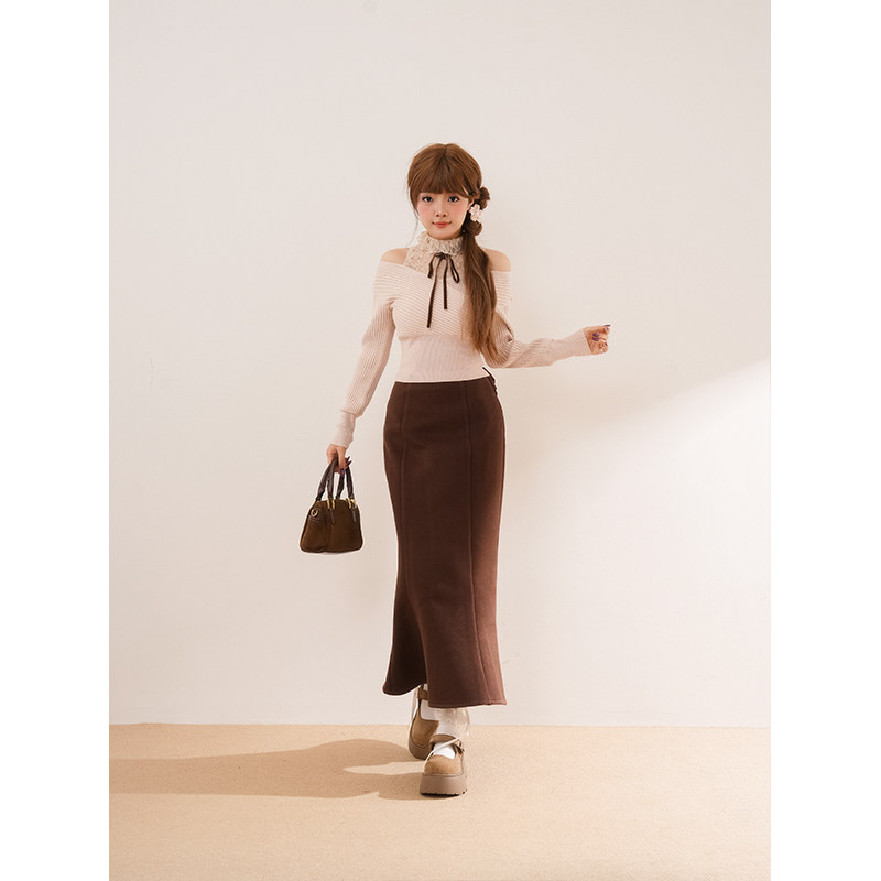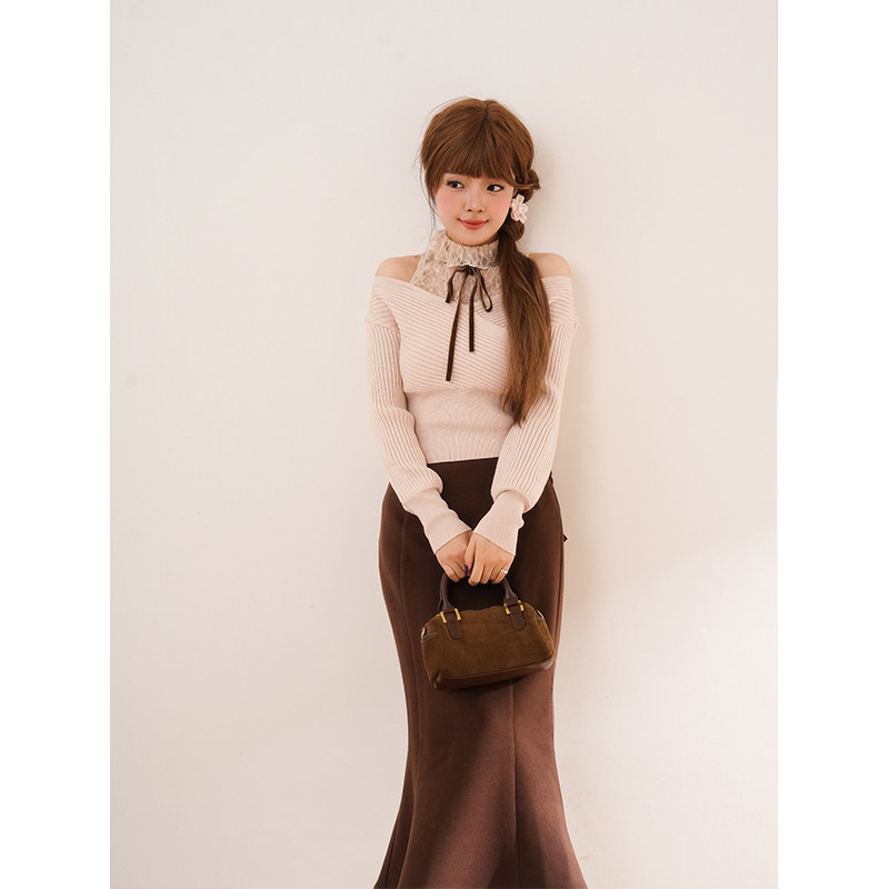 巧克力恋人 甜美名媛千金春秋女蕾丝一字肩毛衣鱼尾半裙两件套装