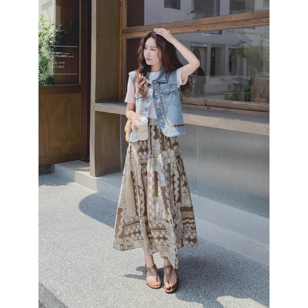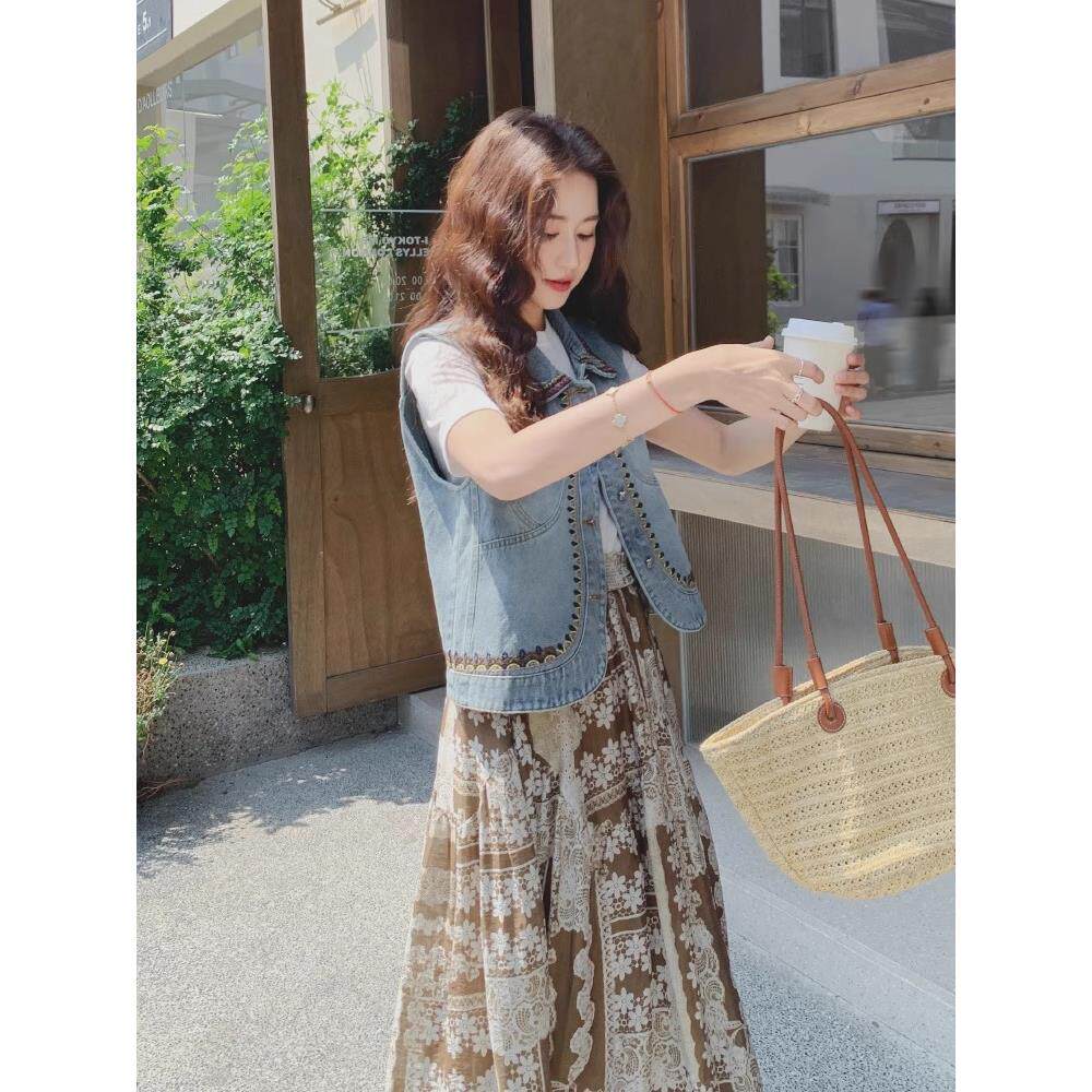 初夏搭配一整套大码胖mm牛仔马甲半身裙高级感复古叠穿三件套装女