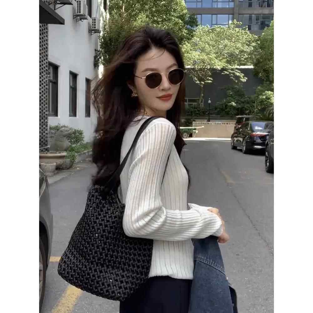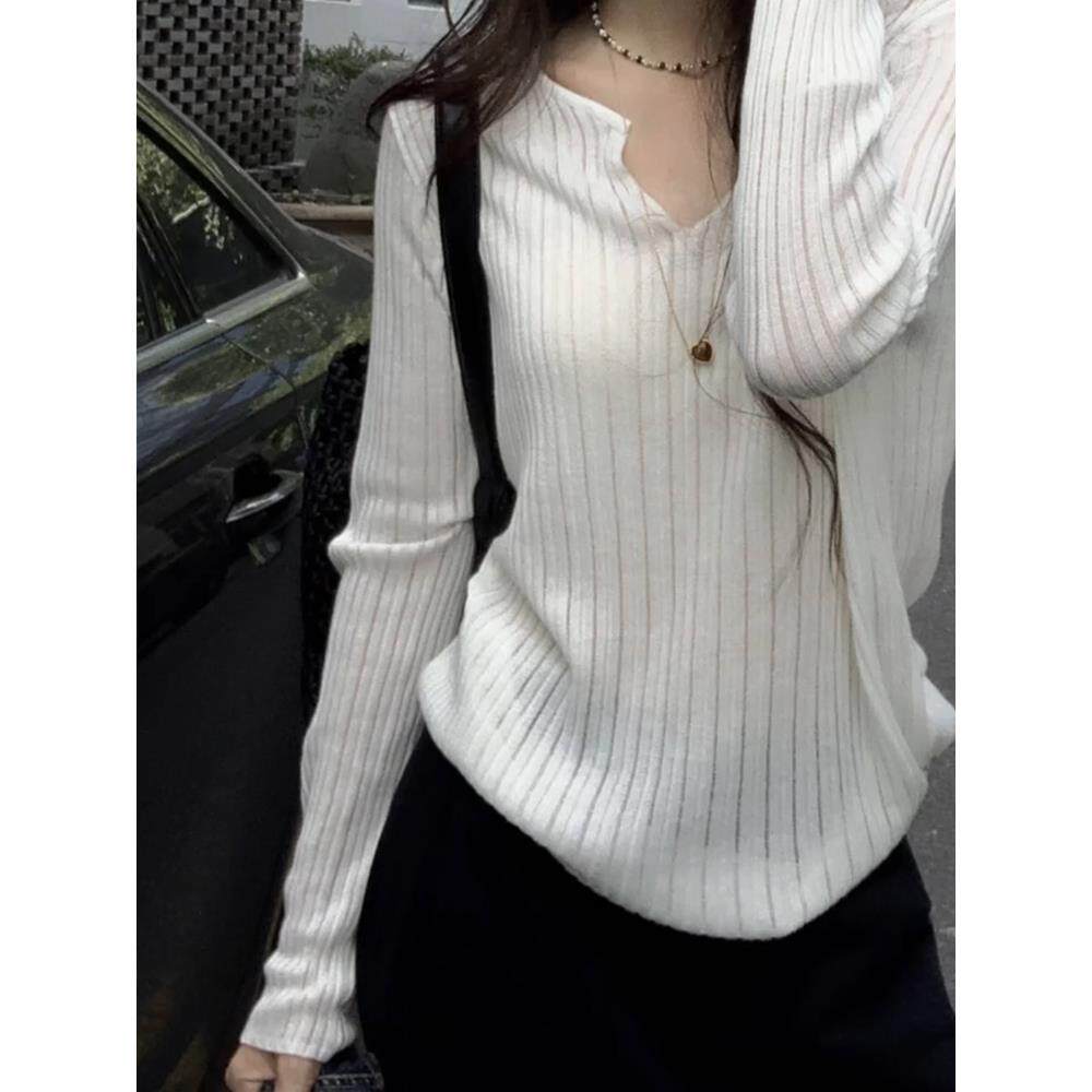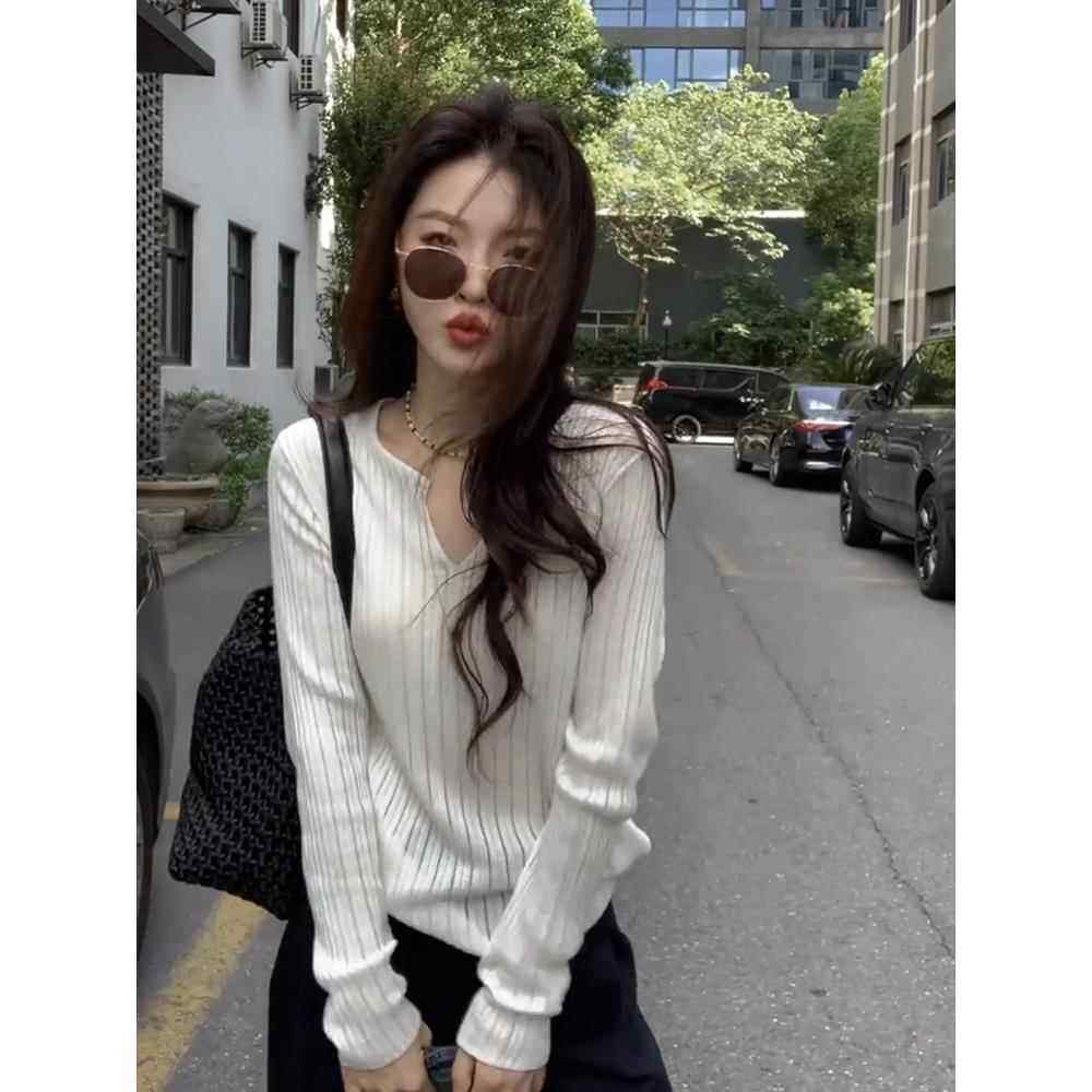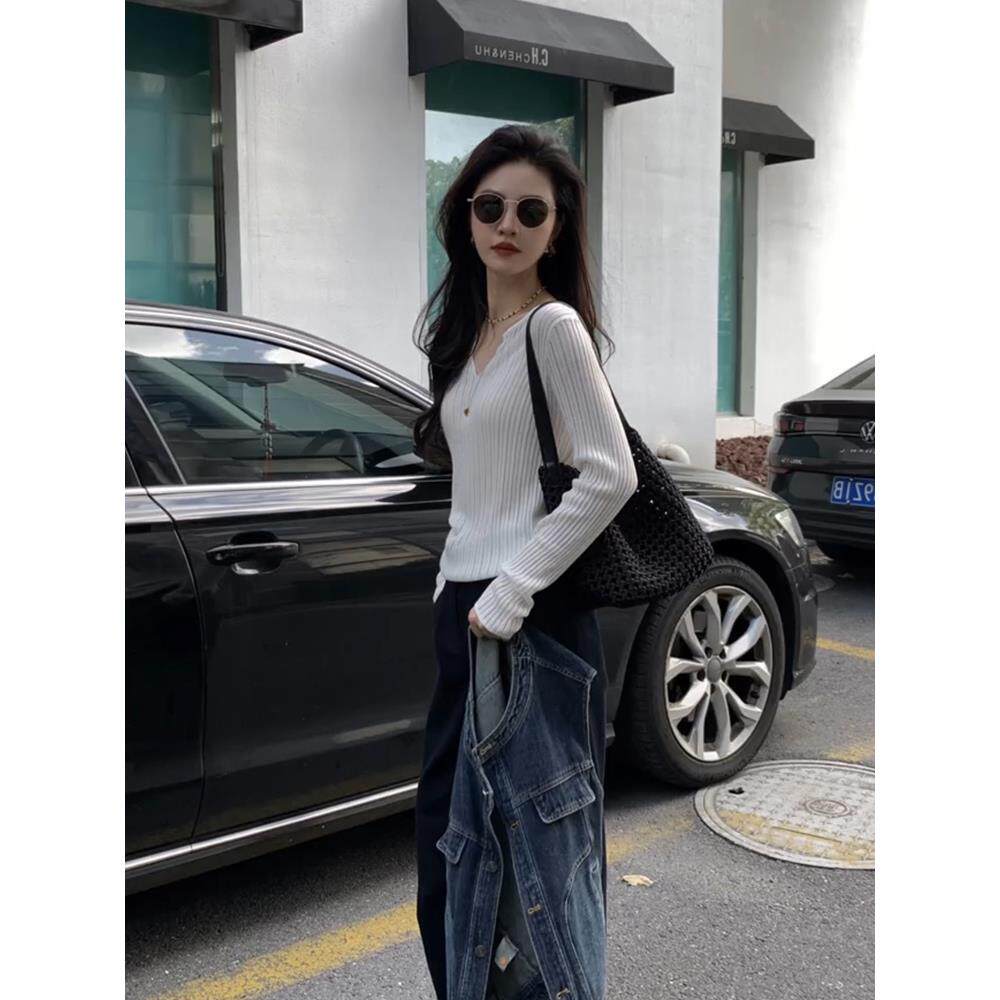 法式白色肌理感v领长袖针织衫女早秋别致设计感修身短款单穿上衣