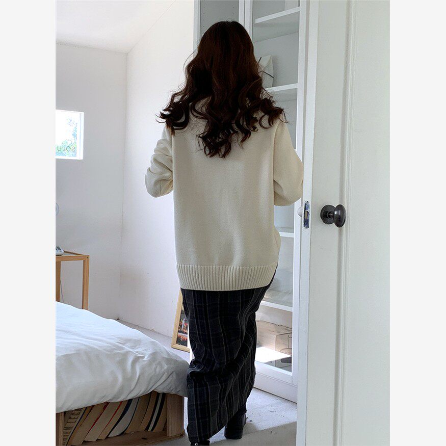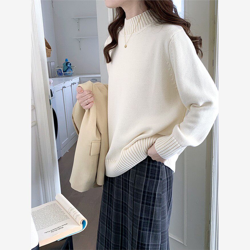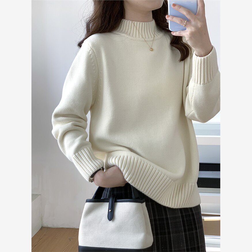 全棉秋冬女式半高领毛衣,宽松外搭,慵懒风格,加厚套头针织下装