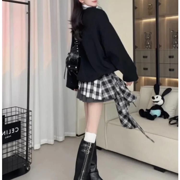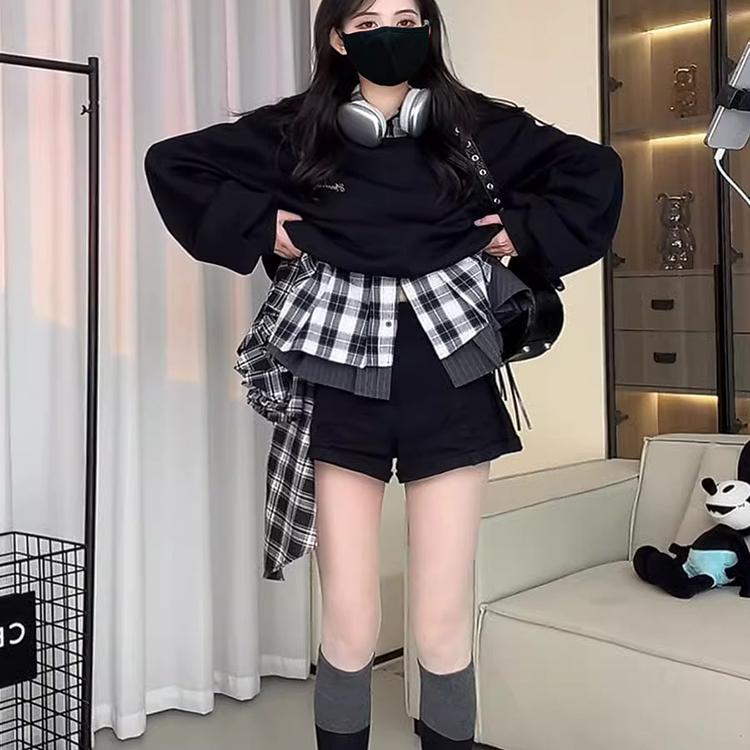 慵懒风2025春秋宽松显瘦百搭格子半身裙假两件卫衣上衣连衣裙子女
