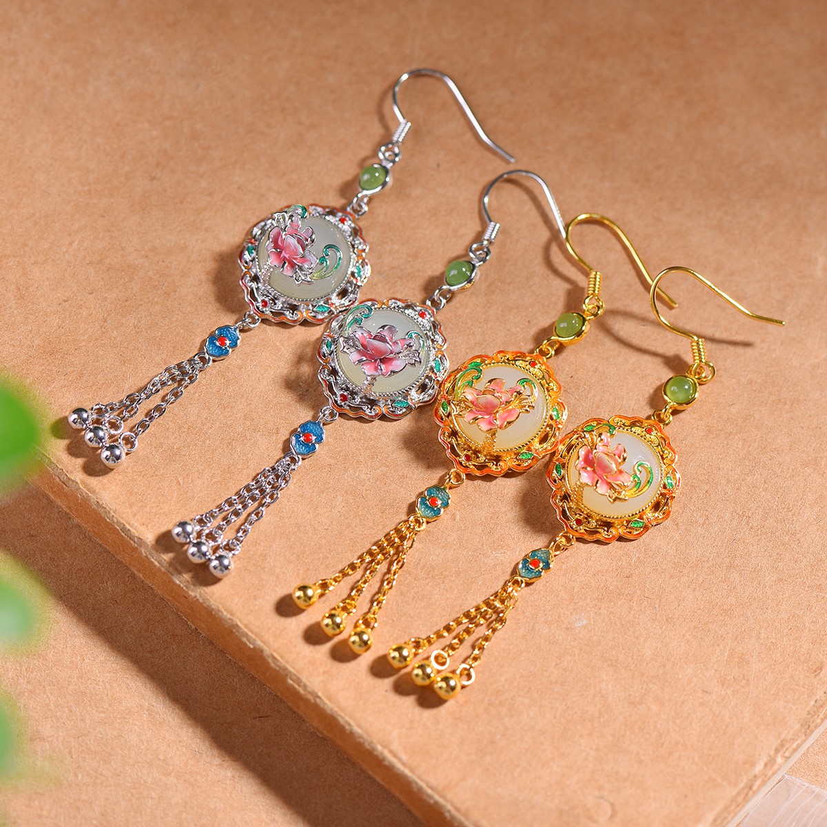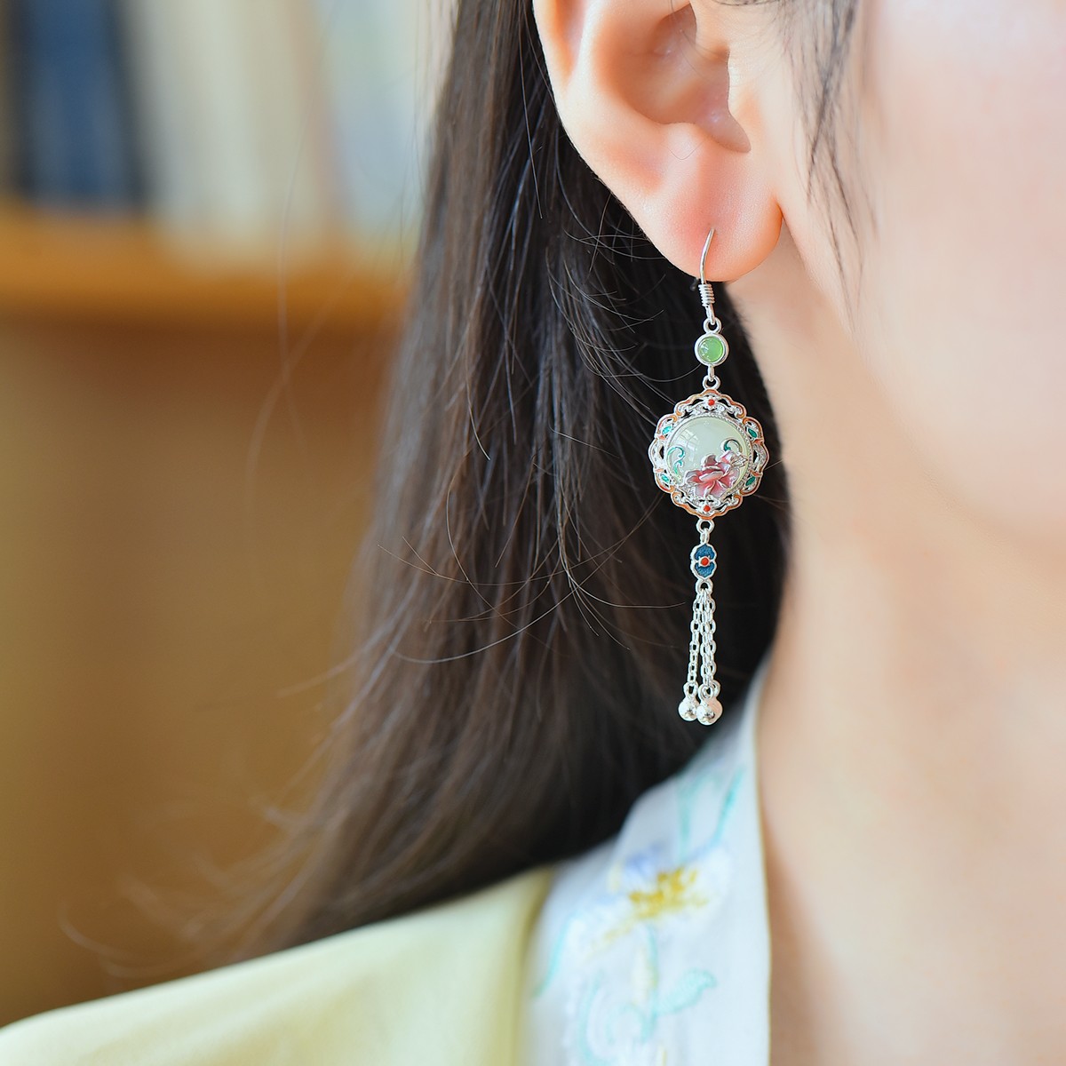 天然和田玉白玉925银镶嵌珐琅小众古风蛋面流苏耳坠玉石耳饰耳环