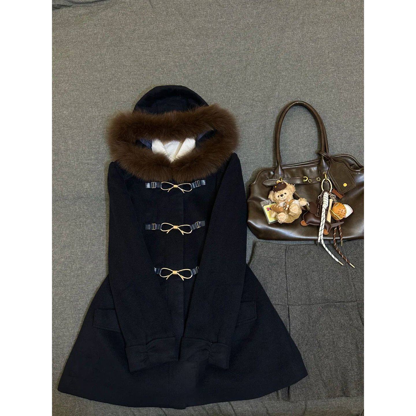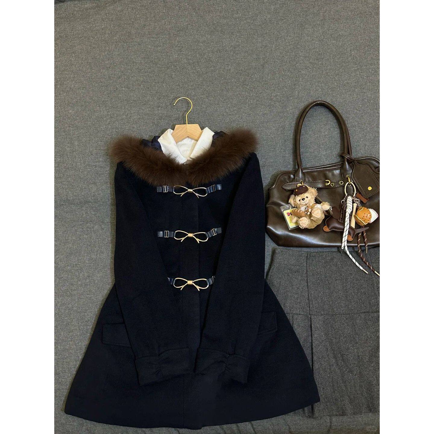 复古毛语 古早感miu系大衣冬季新款千金风学院蝴蝶结毛绒拼接外套