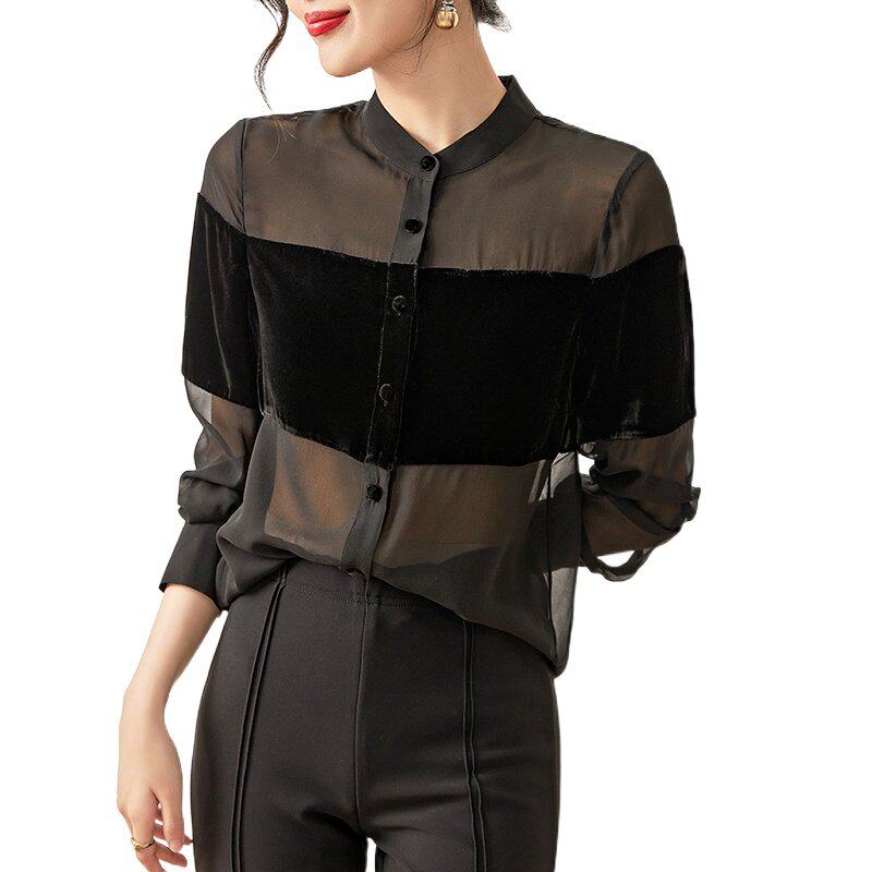 衬衫黑色南油女装轻薄透视82576正品高级感时尚上衣秋季丝绒拼接
