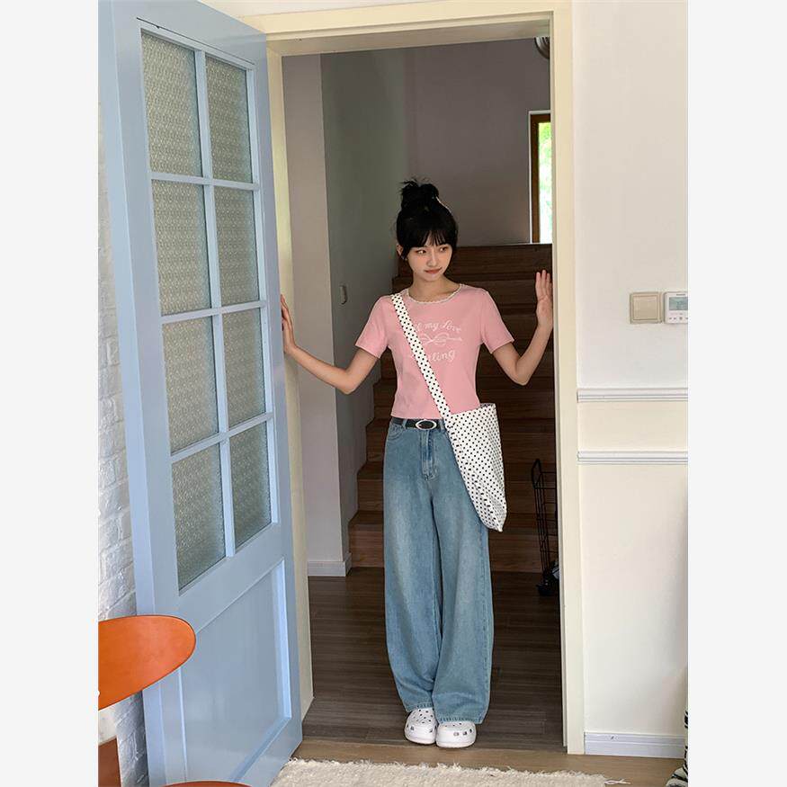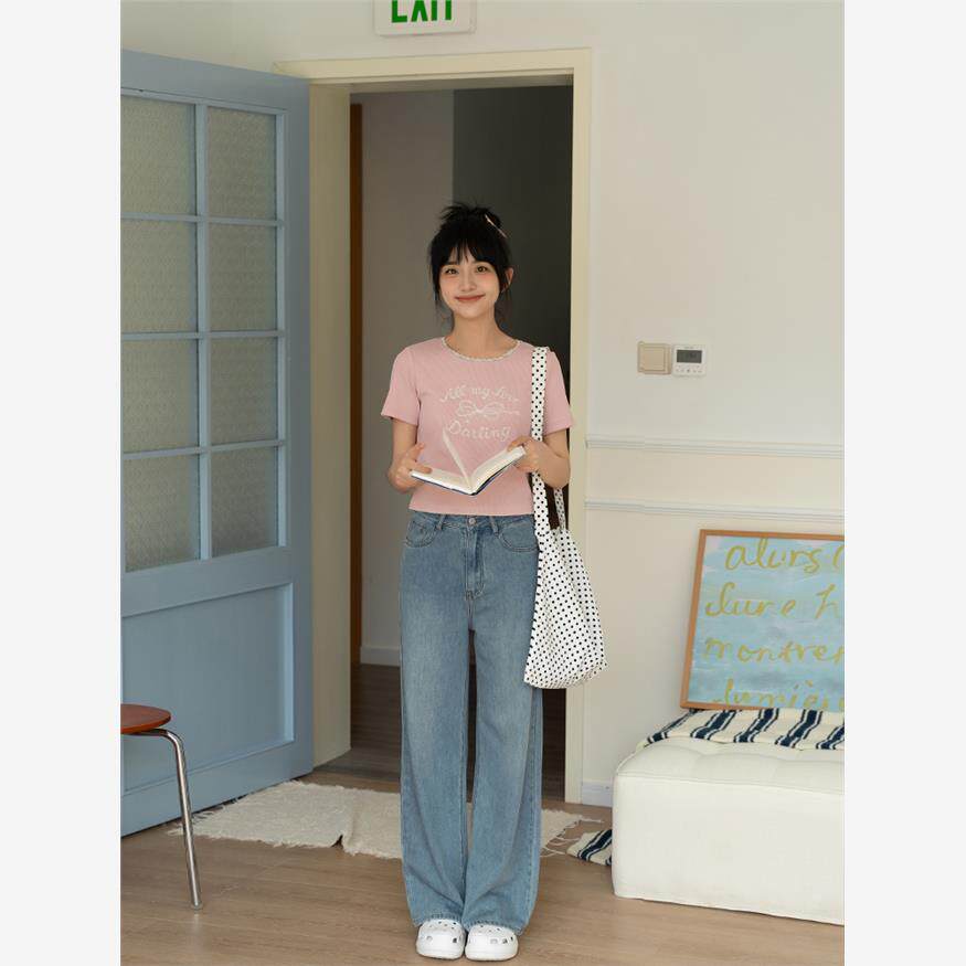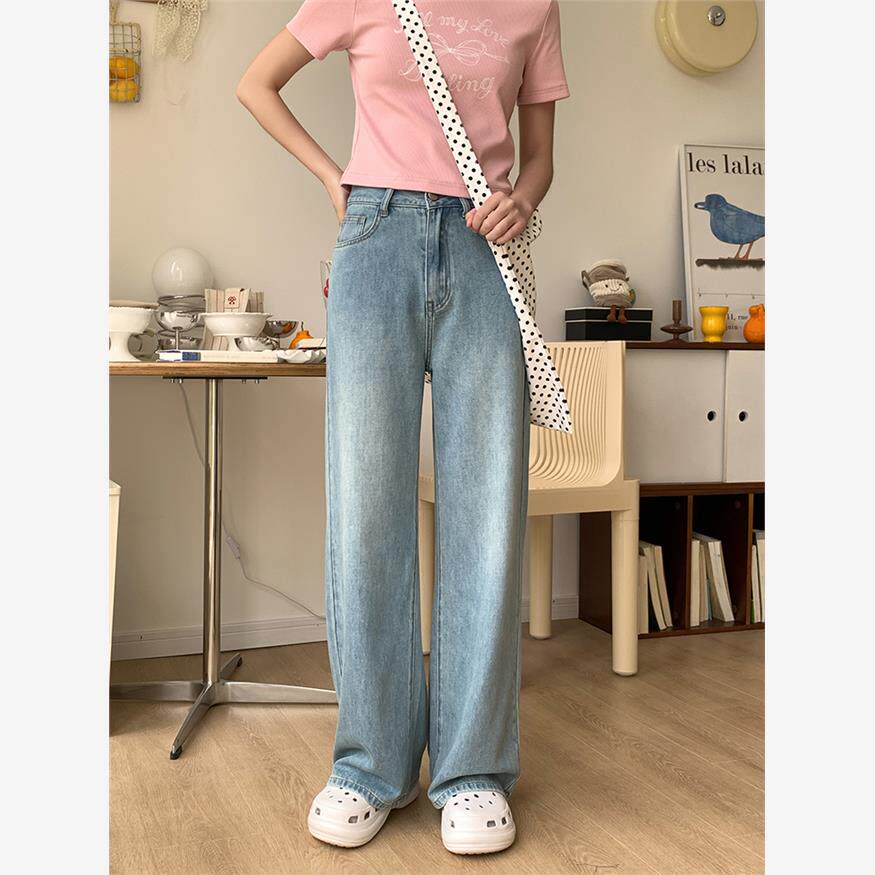 忠犬小八梨形自制休闲宽松直筒牛仔裤女小个子浅蓝薄款长裤裤子