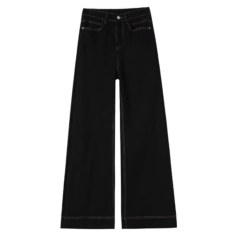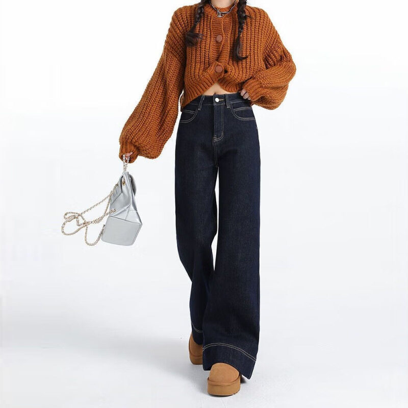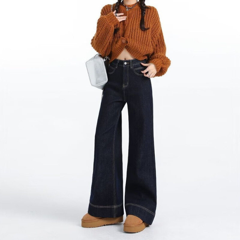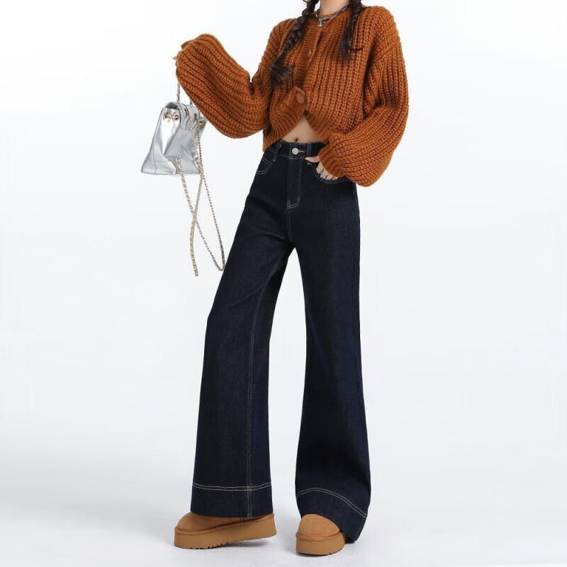2025新款冬季高腰设计感时髦加绒加厚阔腿牛仔裤女垂感拖地裤子