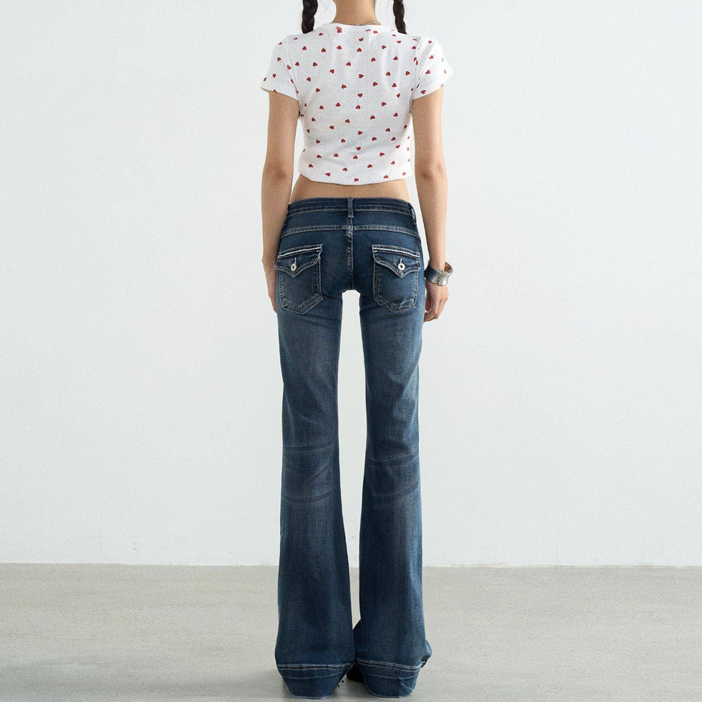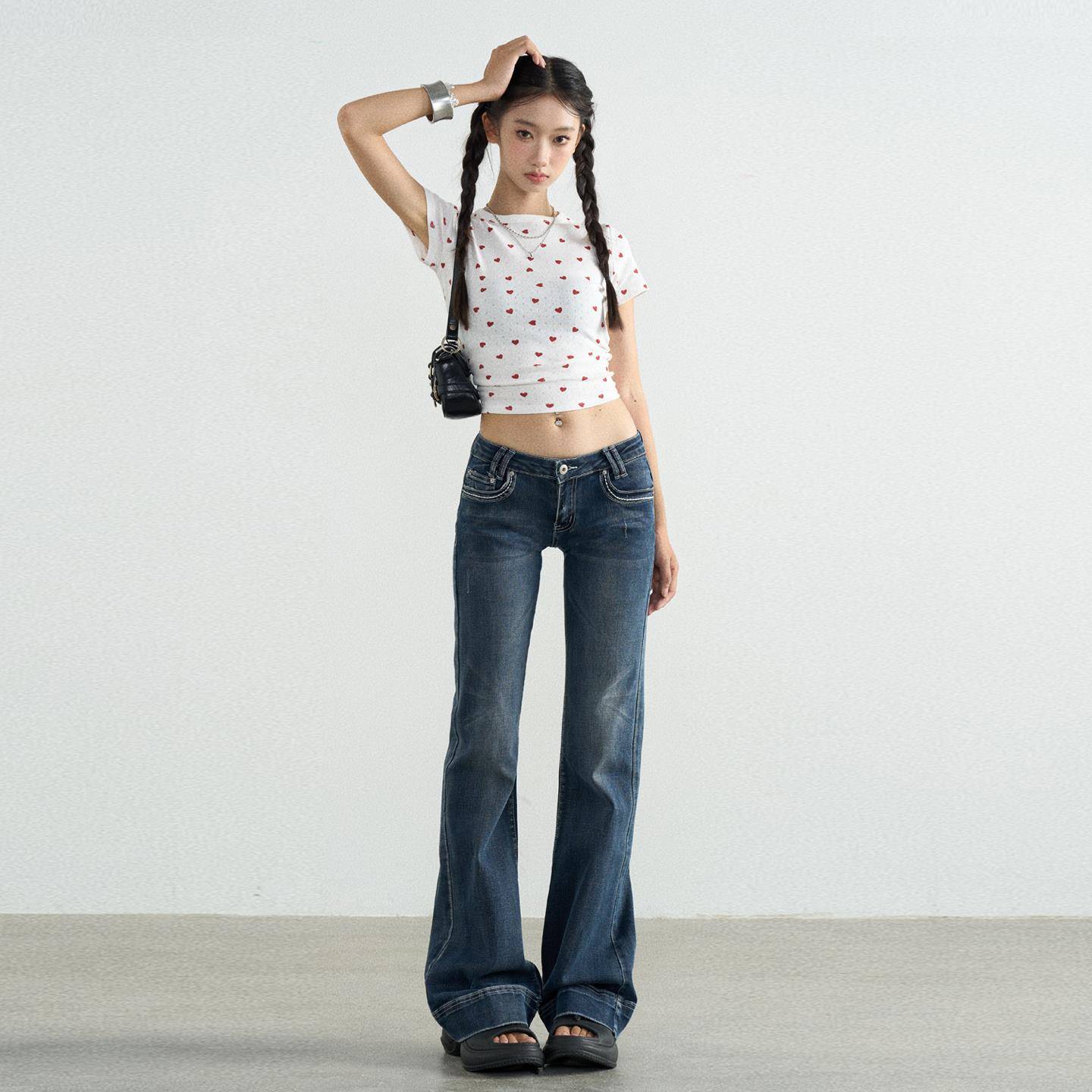 TGXQ美式牛仔裤女2025新款覆古水洗蓝拖地辣妹弹力超低腰微喇叭裤