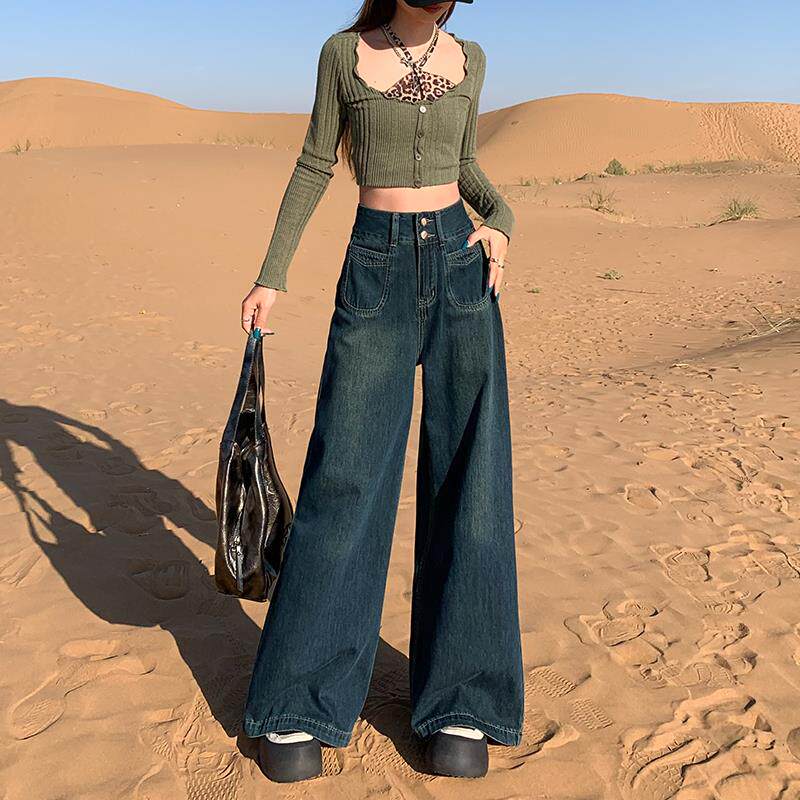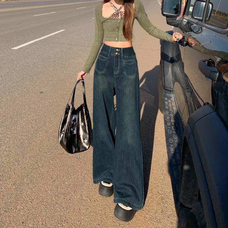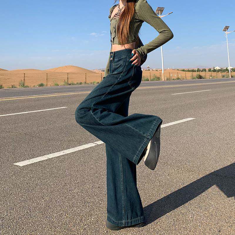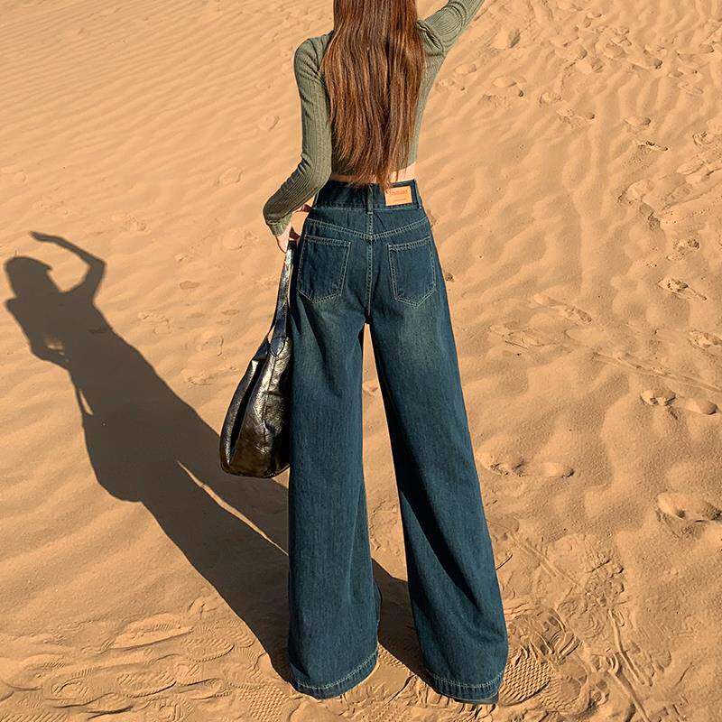 美式覆古阔腿牛仔裤女2025春夏新款高腰显瘦垂感设计感百搭拖地裤