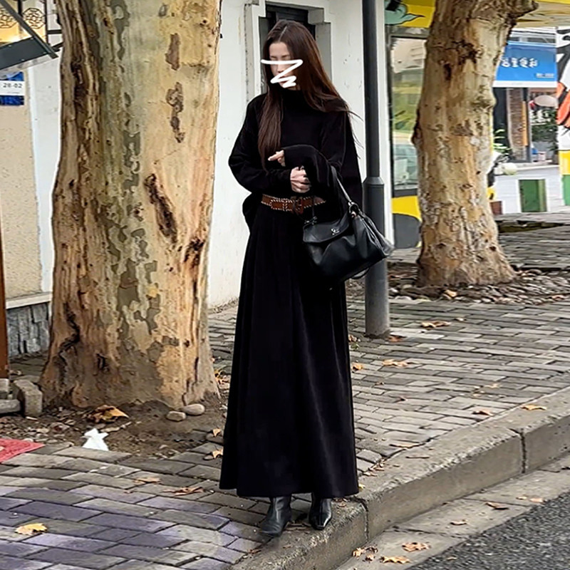 2024新款高级感黑色针织连衣裙子女秋冬季慵懒风穿搭一整套装长裙