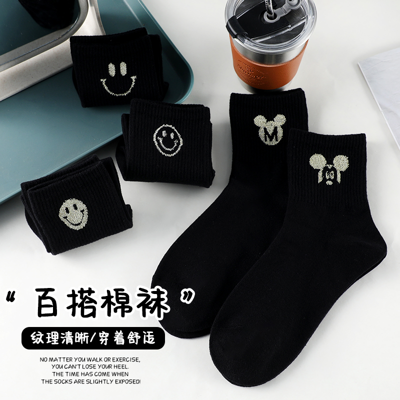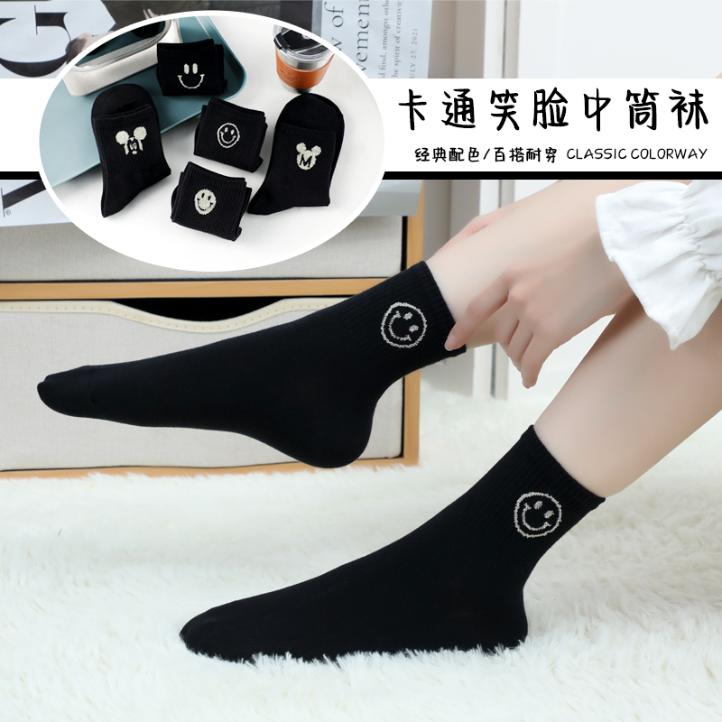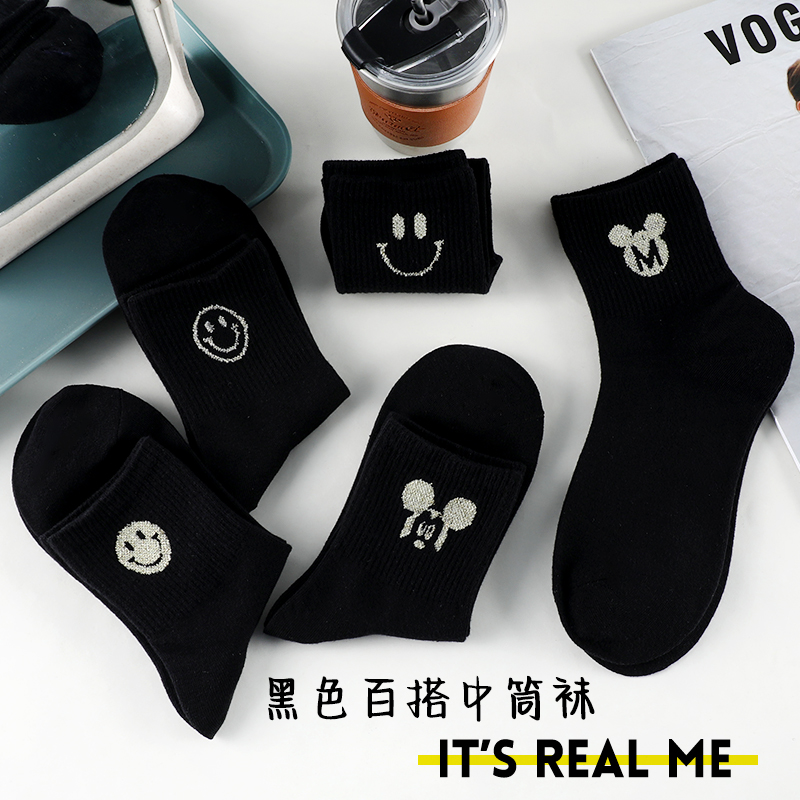 袜子女黑色中筒可爱卡通袜纯棉ins潮百搭森系高颜值学生运动棉袜