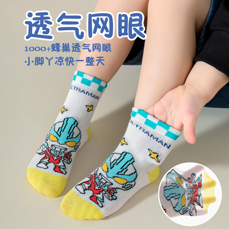 正版奥特曼儿童袜子夏季无骨抗起球抗菌防臭春秋棉袜网眼透气吸汗
