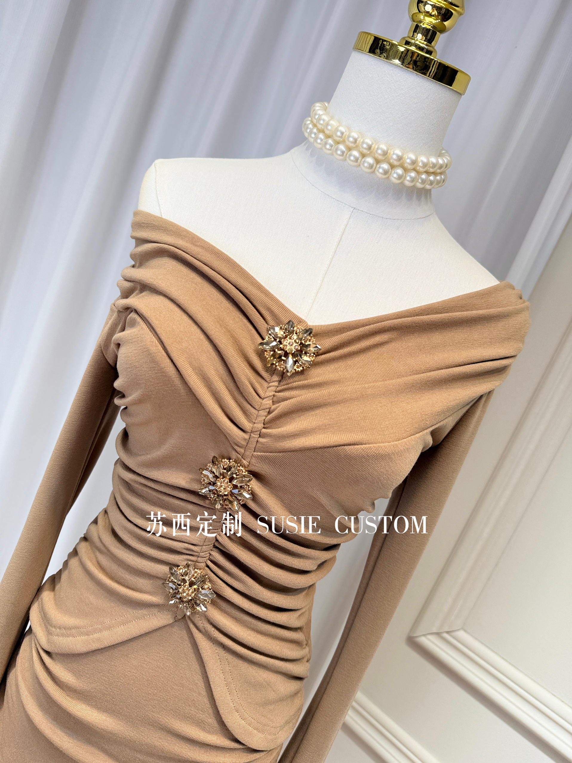 定制款纯欲风显身材多种穿法V领一字肩斜肩可拆卸钻扣褶皱包臀裙