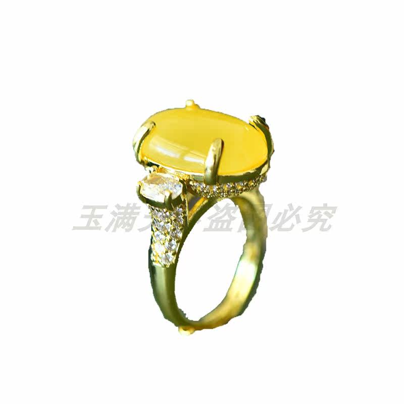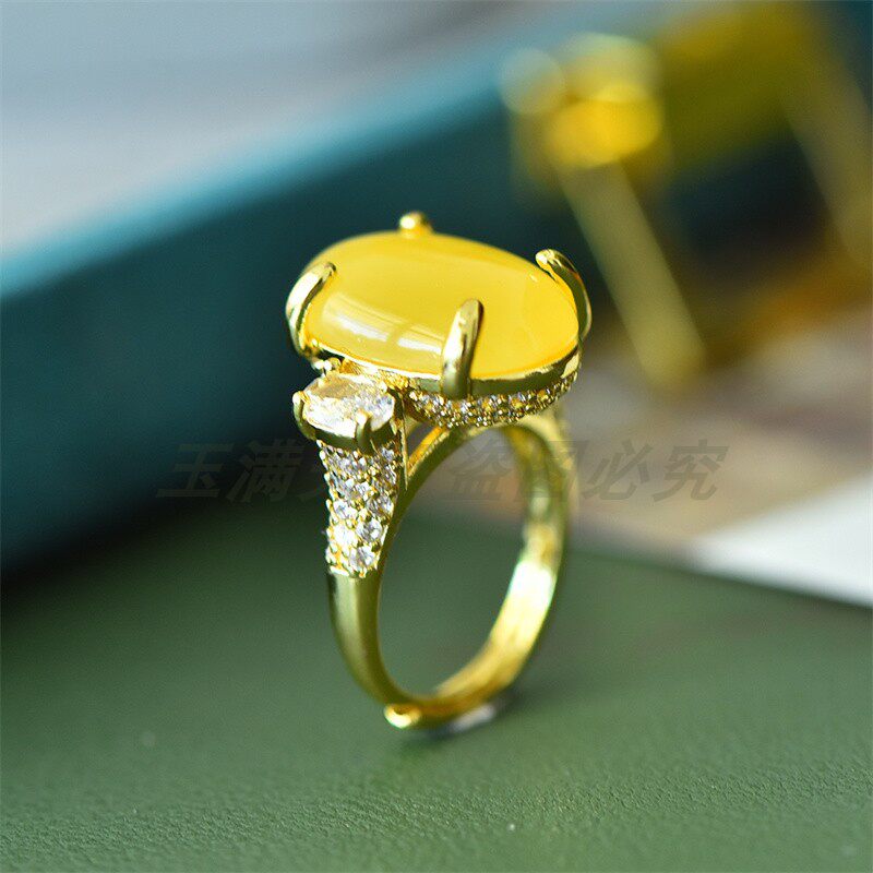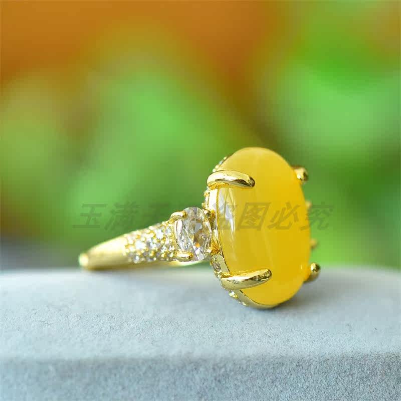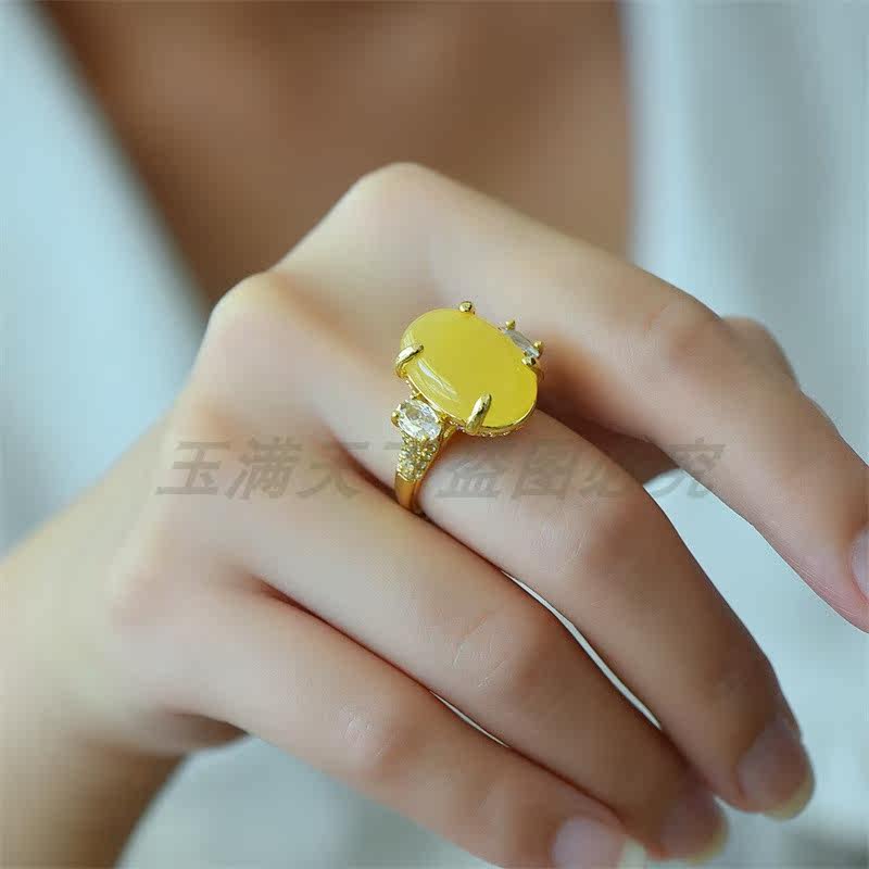 天然蜜蜡琥珀时尚戒指女款椭圆镶嵌鸡油黄指环活口手饰可调节戒圈